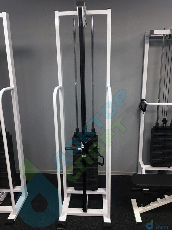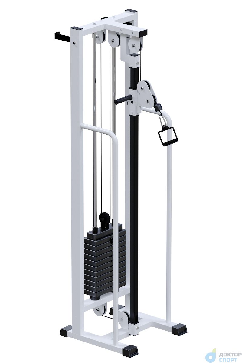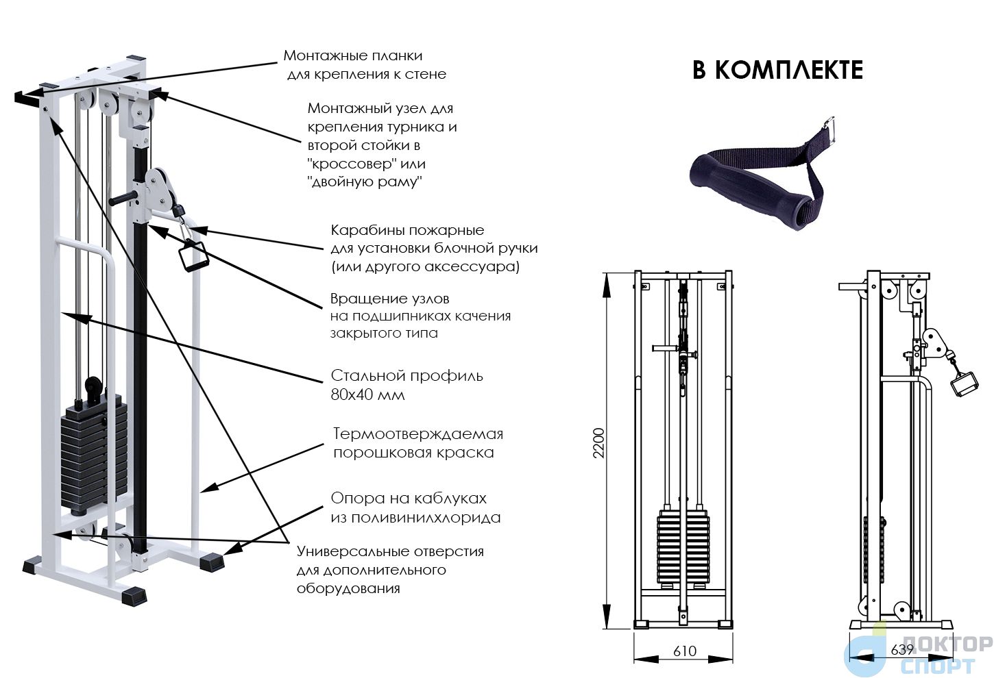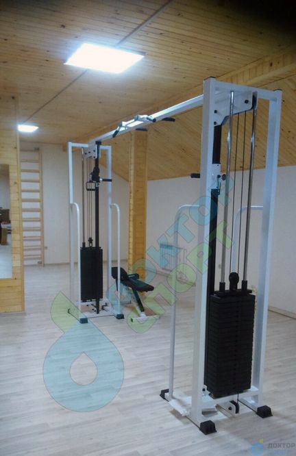 Многофункциональный тренажер "Атлант" представляет собой блочную раму с перемещающимся ригелем. Тяга грузов происходит через блок по свободной траектории в нужном направлении. Внешний блок может быть зафиксирован на расстоянии от 18 до 182 см от пола c шагом в 8 см.