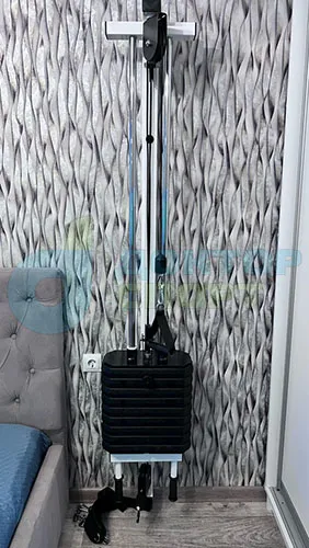 Тренажер для кинезитерапии «Эффект» представляет собой вертикальную раму, имеющую систему блоков, через которую с помощью троса осуществляется тяга грузов в свободном направлении.