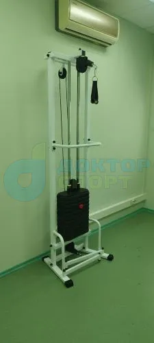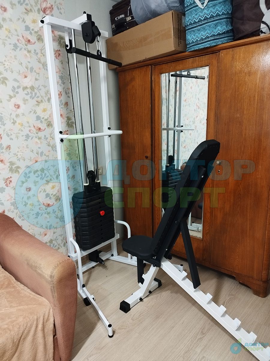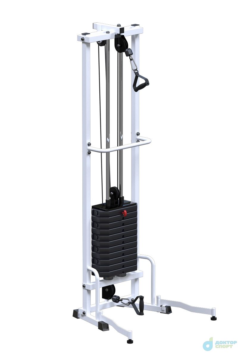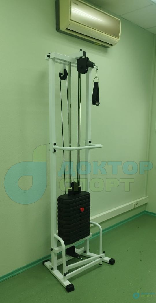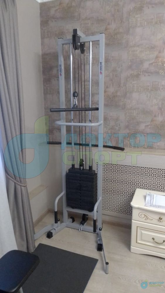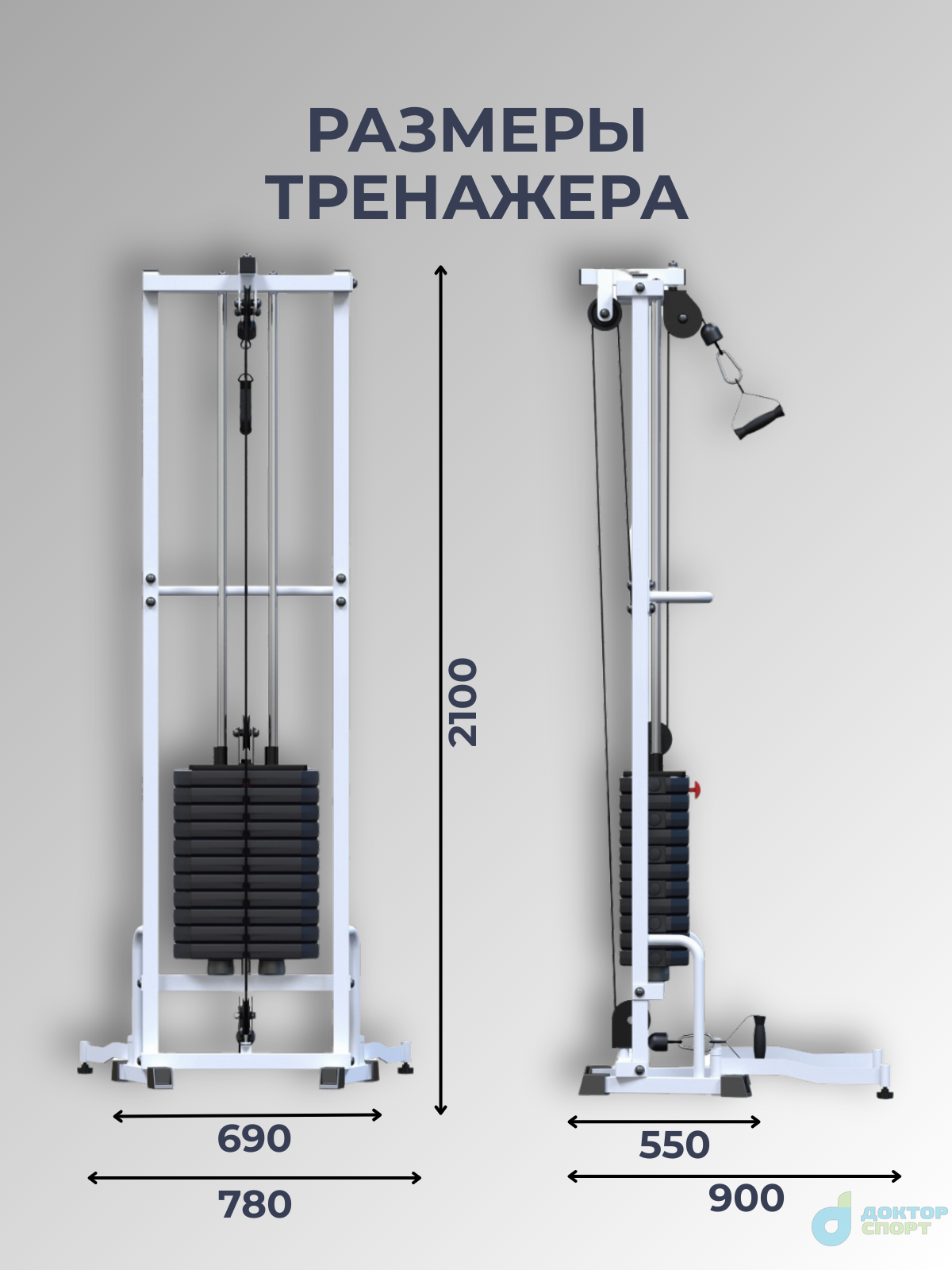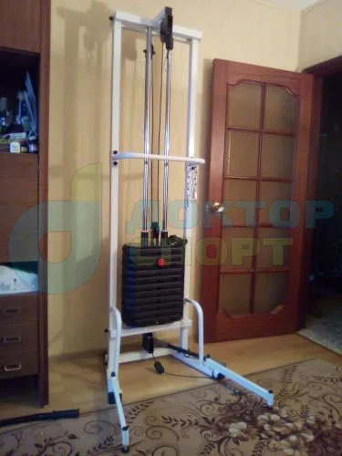 Многофункциональный тренажер «Компакт» представляет собой вертикальную раму, имеющую систему блоков, через которую с помощью троса осуществляется тяга грузов в свободном направлении.