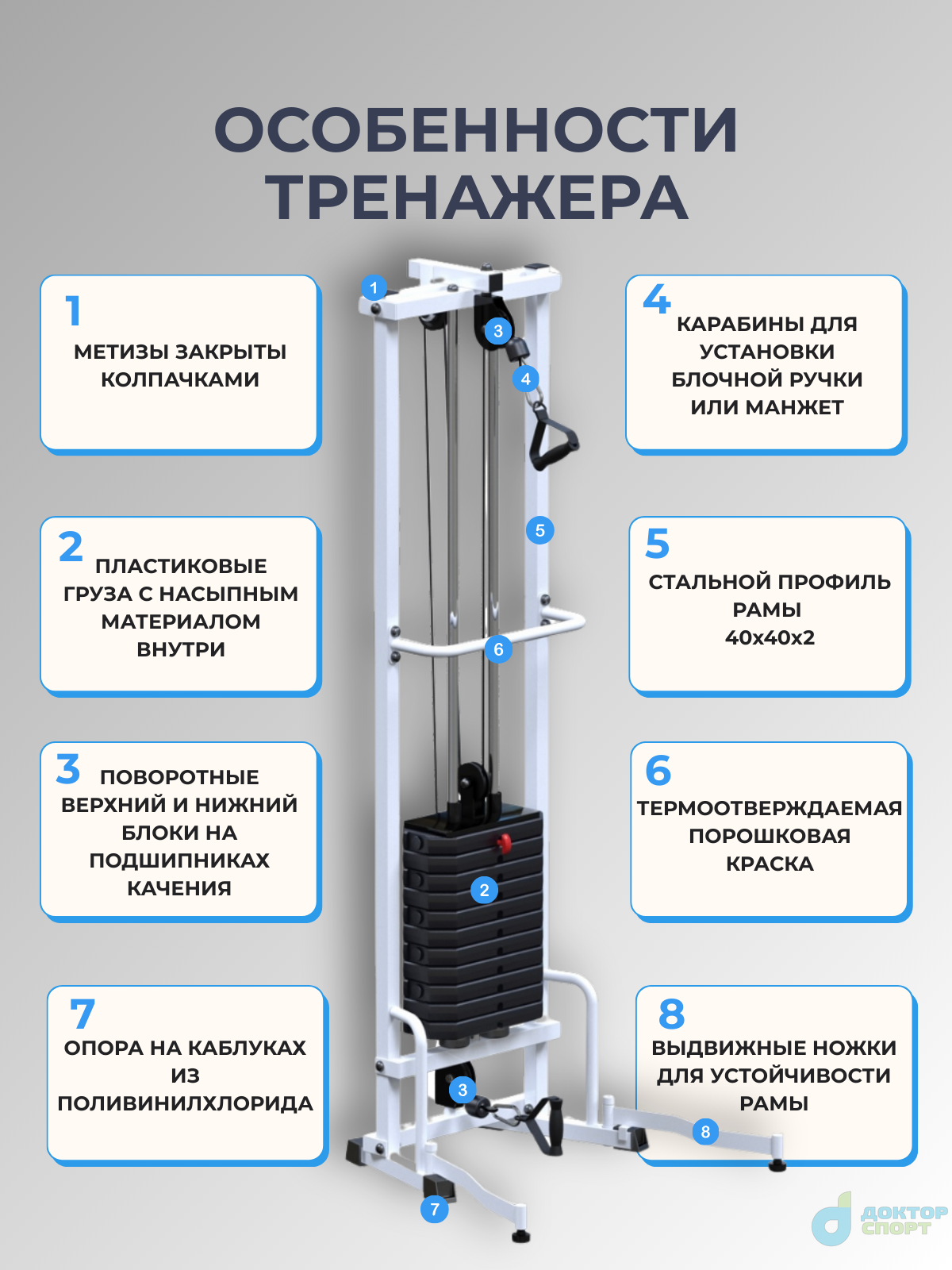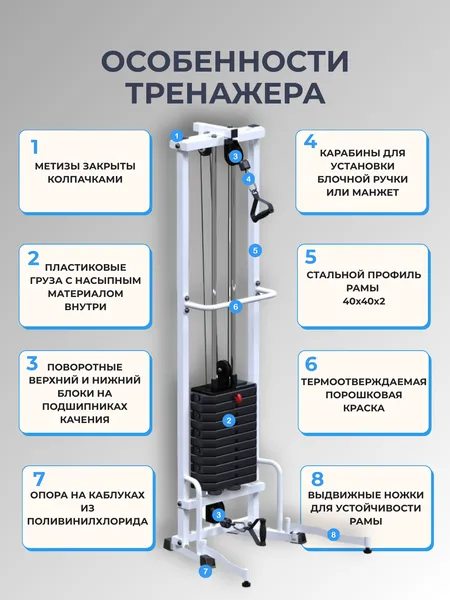Вид тренажераодиночная рамаКатегориядомашнийТип рамыразборнаяВес грузоблока60 кгКреплениене требует крепленияМатериал грузовпластикМатериал тросаполиамидный фалПроизводствоРоссияЦветбелый (другой под заказ)Ширина69 смГлубина55 смВысота210 смОбщий вес92 кгОбъем в упаковке0.8 куб.м. -