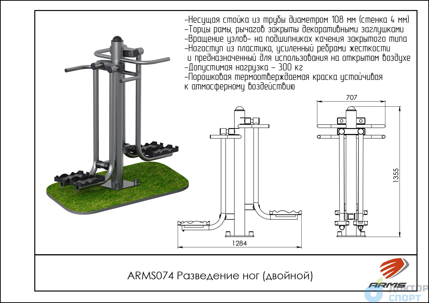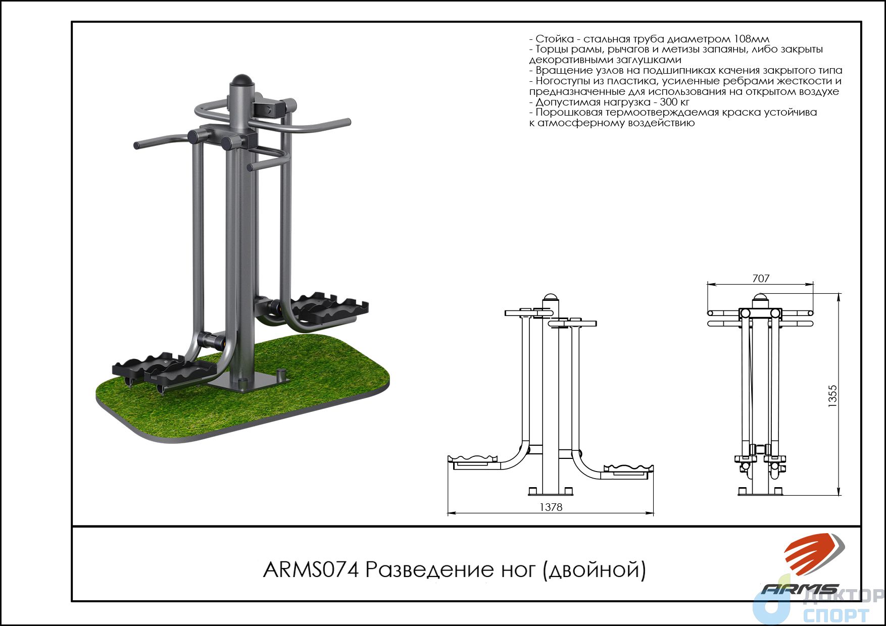 Предназначение: Тренажер предназначен как для одного пользователя, так и для двух одновременно На позиции разведении ног, встаете на педали, держитесь за рукоятки и постепенно разводите ноги в стороны добиваясь растяжения мышц бедер. Развиваются мышцы бедер и мышцы живота. -