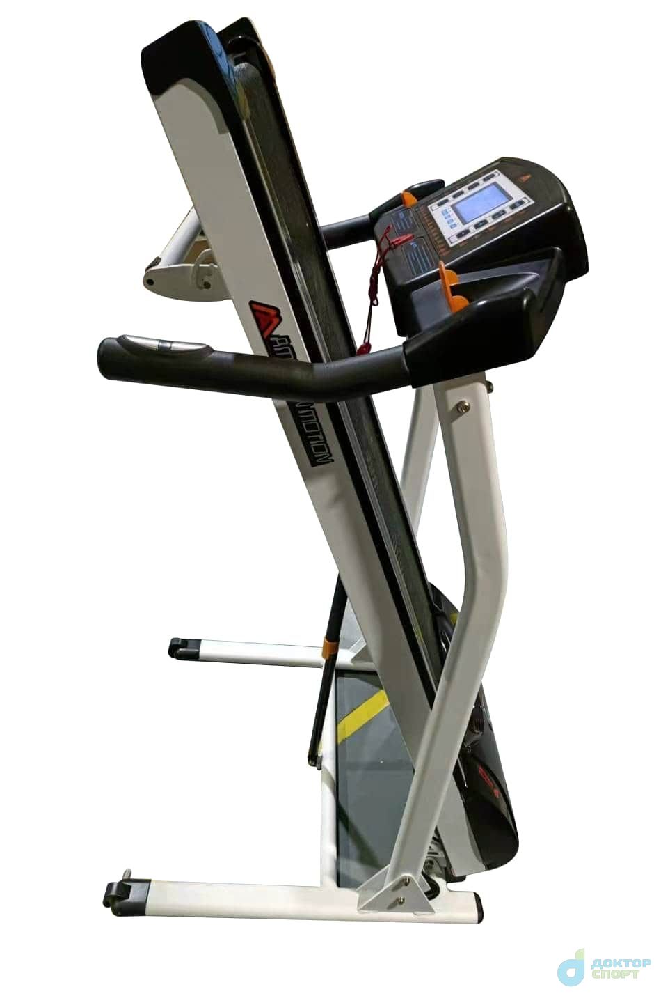 При сложенном беговом полотне тренажер занимает не более 1 кв. метра площади. Опускание полотна также оптимизировано газовыми доводчиками, чтобы случайно не повредить покрытие пола. Доводчики плавно и бесшумно опускают полотно на пол.
