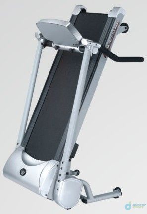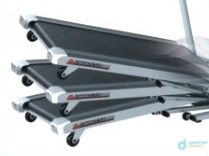 При сложенном беговом полотне тренажер занимает не более 1 кв. метра площади. Опускание полотна также оптимизировано газовыми доводчиками, чтобы случайно не повредить покрытие пола. Доводчики плавно и бесшумно опускают полотно на пол.