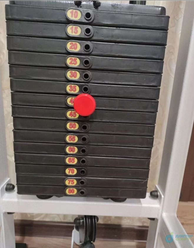 - Стек грузоблока состоит из высококачественных цельнометаллических обрезиненных грузов по 5 кг и направляющей. Нагрузка тренажера изменяется с помощью фиксатора. Груза приводятся в движение с помощью троса диаметром 4 мм с усилием на разрыв 550 кг с максимальной нагрузкой 850 кг.
