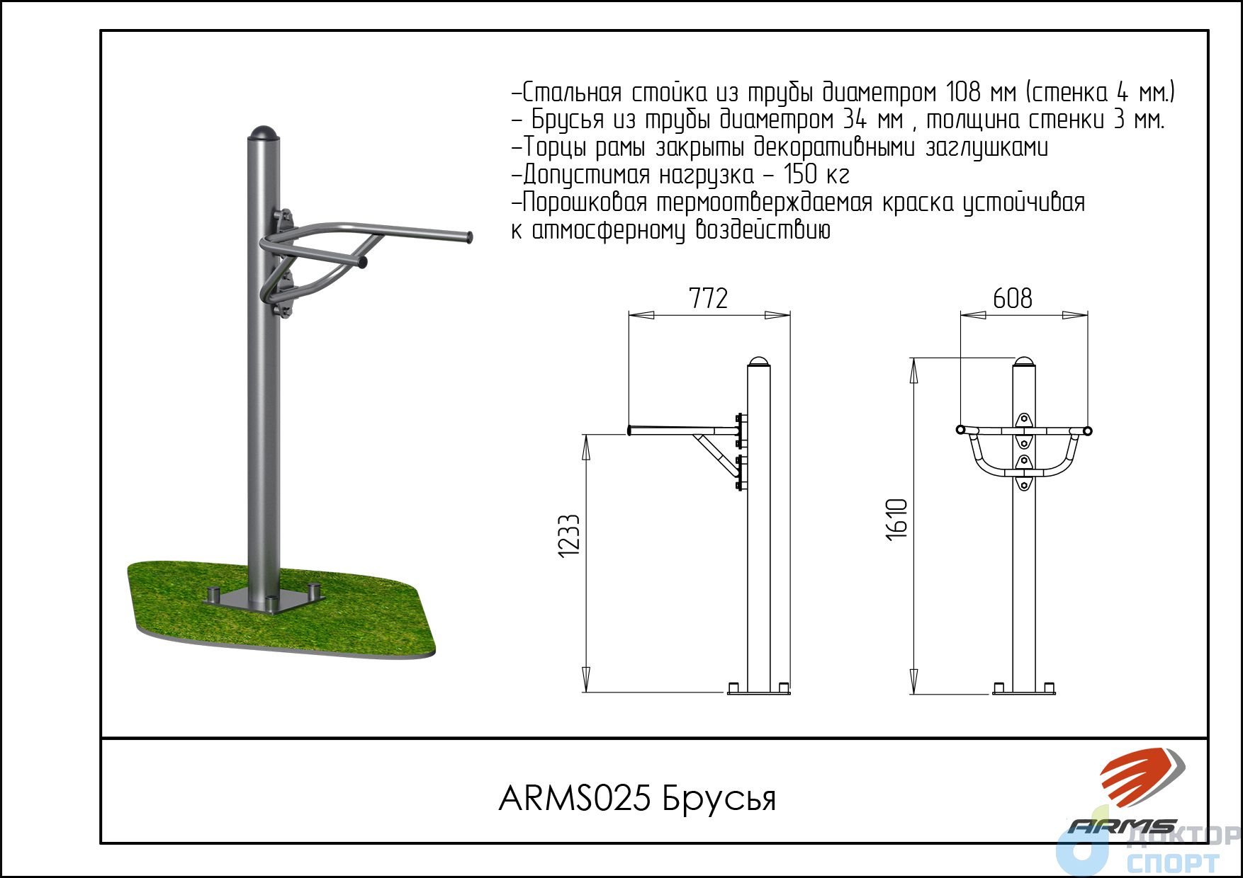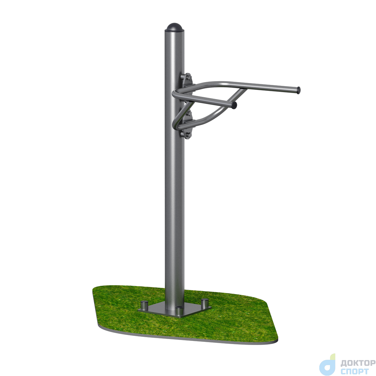 Предназначение: Тренажер предназначен для одного пользователя. Пользователь руками держится за брусья, ноги подгибает навесу и, выпрямляя руки в локтях, выполняет отжимание. Развиваются мышцы рук, мышцы живота и спины. -
