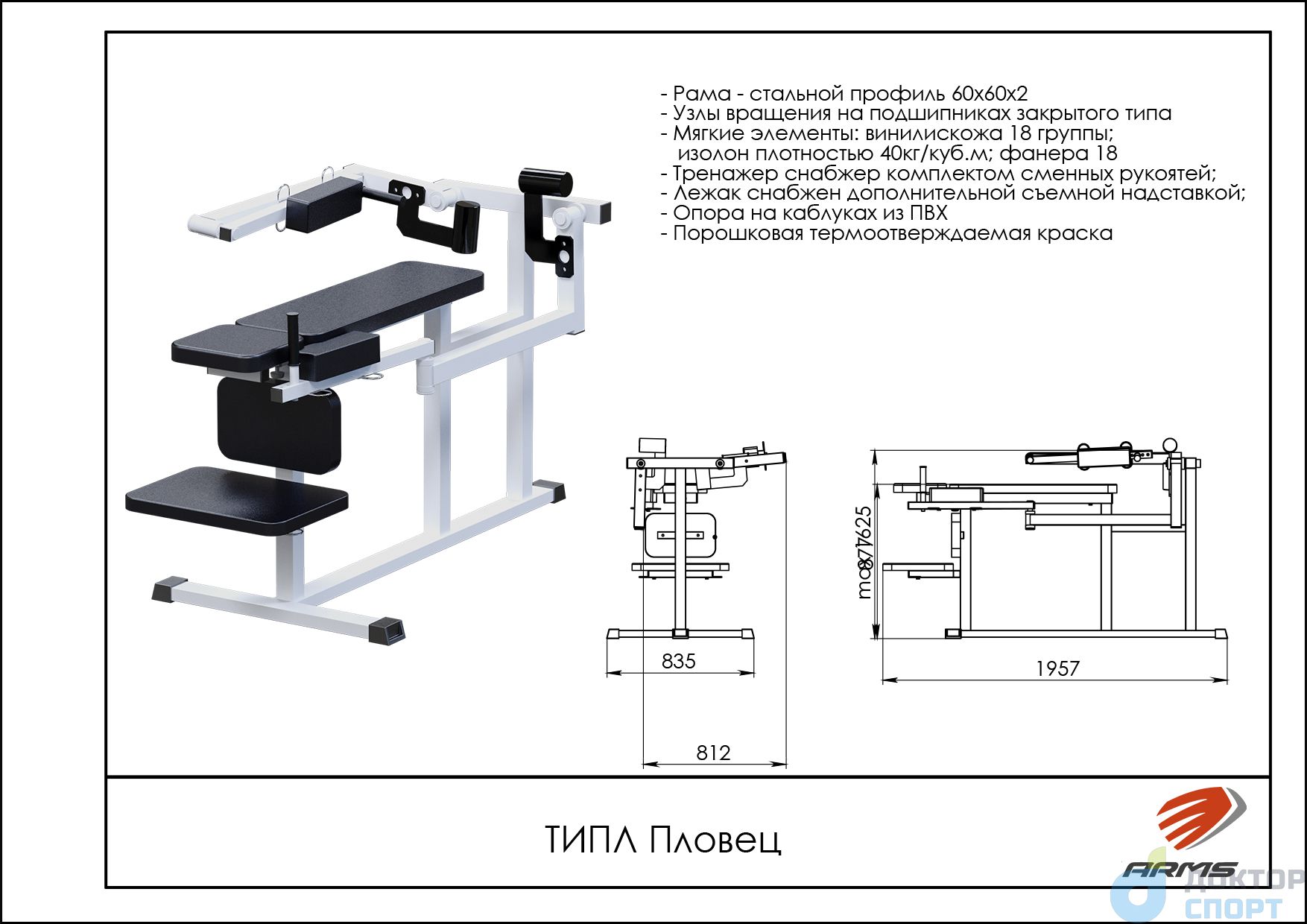 Описание: Тренажер предназначен для растяжки и разработки позвоночника, плечевых суставов рук. Тренажер «ПЛОВЕЦ» в отличие от других тренажеров для плавания, позволяет грести прямыми руками (при реабилитации это важно), а также ряд других комплектующих, позволяющих разрабатывать нужные мышцы и суставы. Тренажер имеет 2 режима работы: Режим работы № 1. Встаем коленями на стульчик и ложимся на лежак, при этом, делаем фиксацию ног и работаем (делаем гребки) прямыми руками (именно прямые руки, что очень важно, нужно и тяжело). Руки фиксируются до локтя ремнями. Режим работы № 2. Вставляем дополнительную съемную горизонтальную «сидушку» и ложимся на спину. Работаем лежа на спине, ноги при этом зафиксированы за лодыжки. -