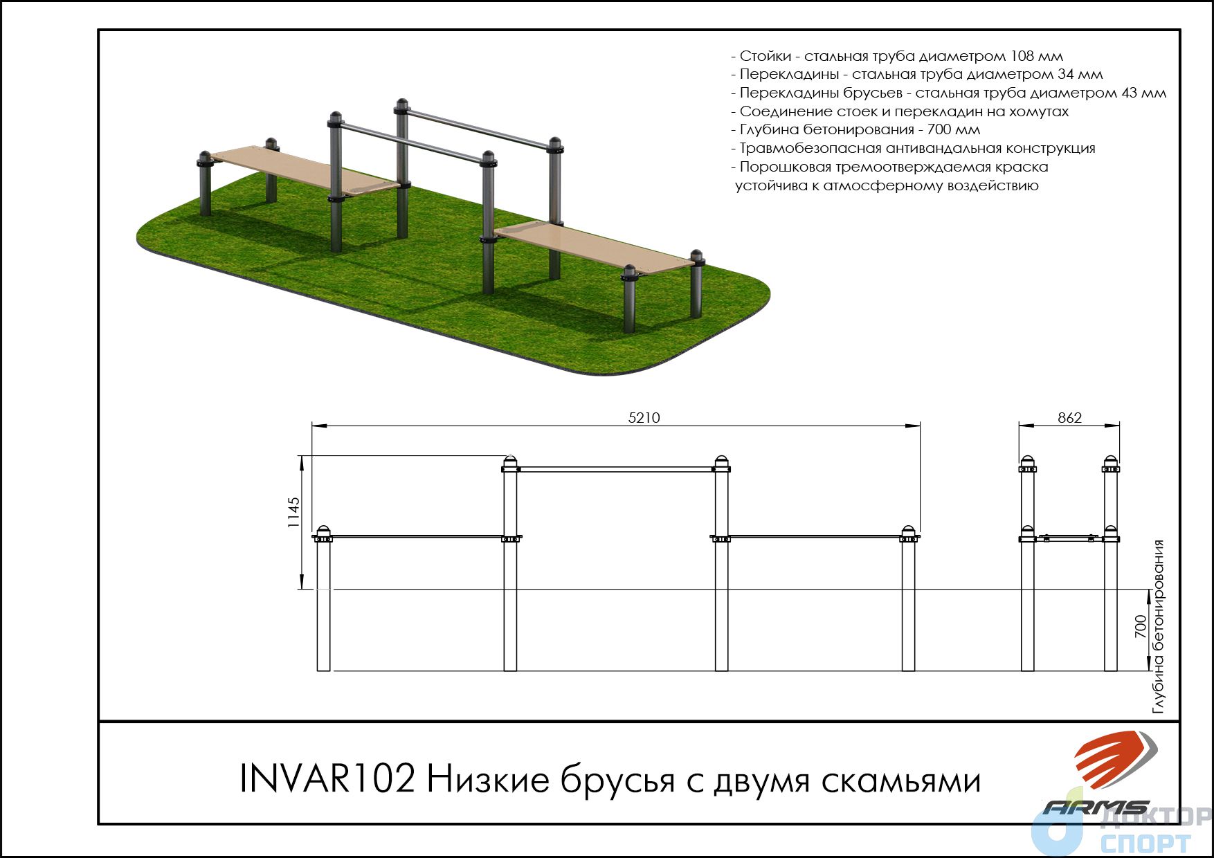 Низкие брусья с двумя скамьями