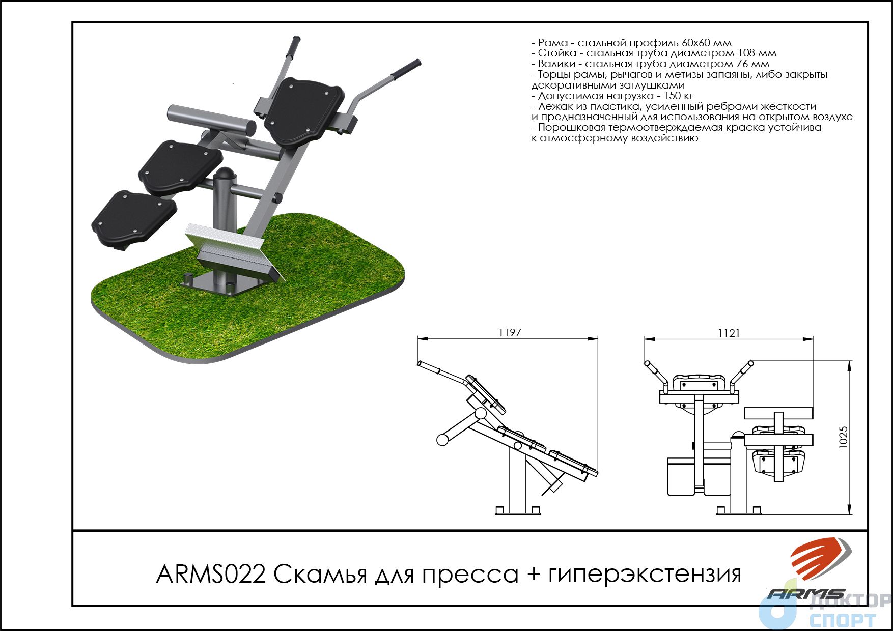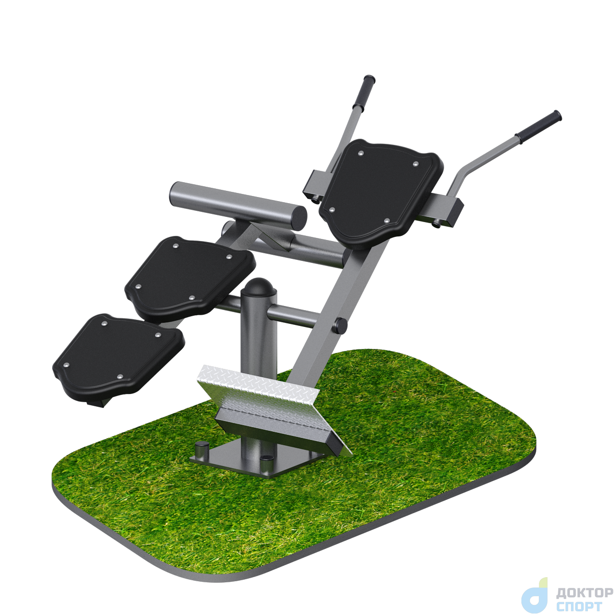 Предназначение: Тренажер предназначен как для одного пользователя, так и для двух одновременно. Пользователь встает на опору для ног, фиксирует ноги, передней частью бедер упирается на упор. Развиваются мышцы ног, мышцы живота и спины. Пользователь ложится на спину, ноги фиксирует с помощью валиков и выполняет упражнение пресс. Развиваются мышцы пресса, ног. -