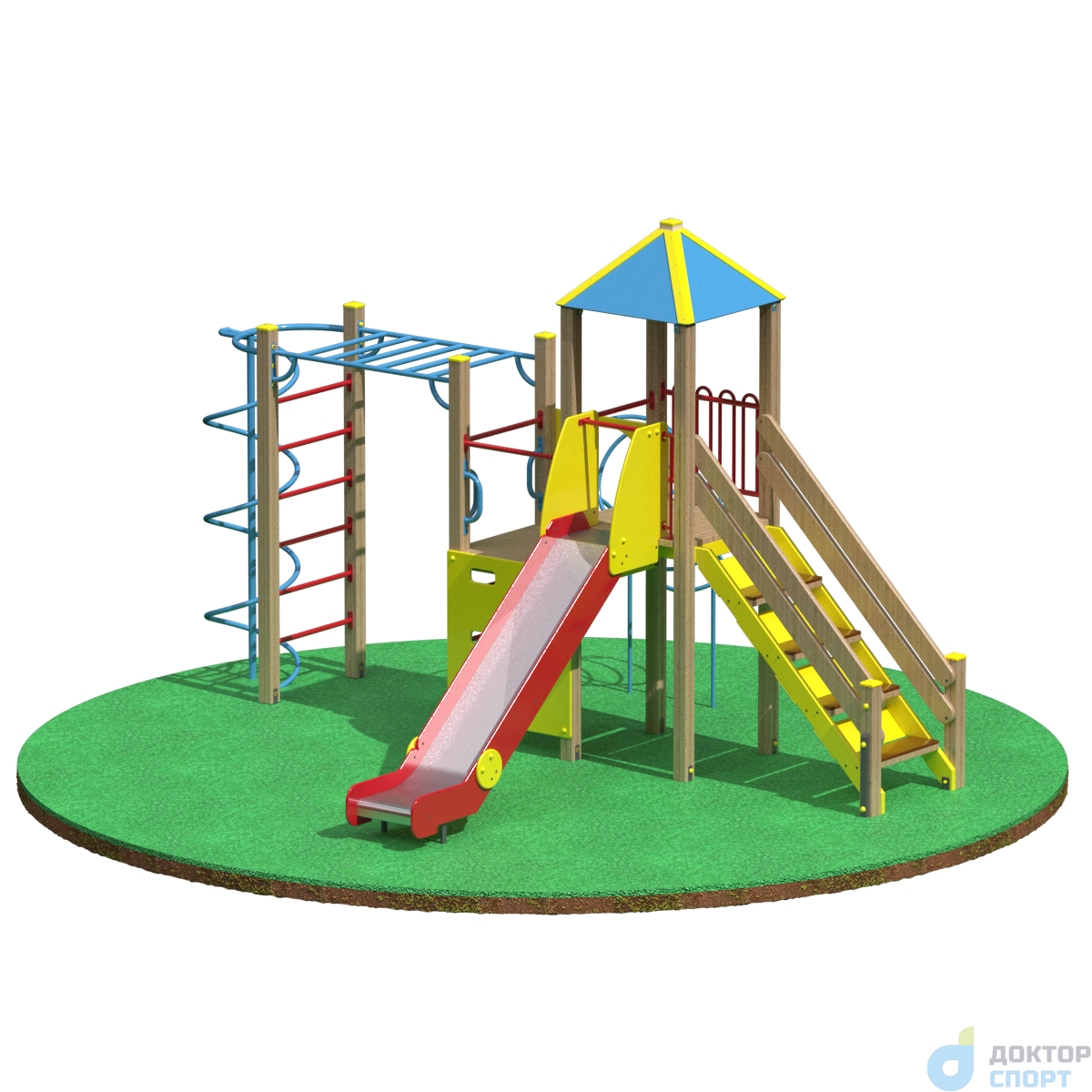 Игровой комплекс оборудован горкой со скатом из нержавеющей стали, вертикальной лестницей и лестницей со ступенями, трубой из колец, альпинистской стенкой с отверстиями для рук и ног, рукохода, шведской стенкой, вертикальным шестом со спиралью, перекладинами, ручками, металлическим ограждением.