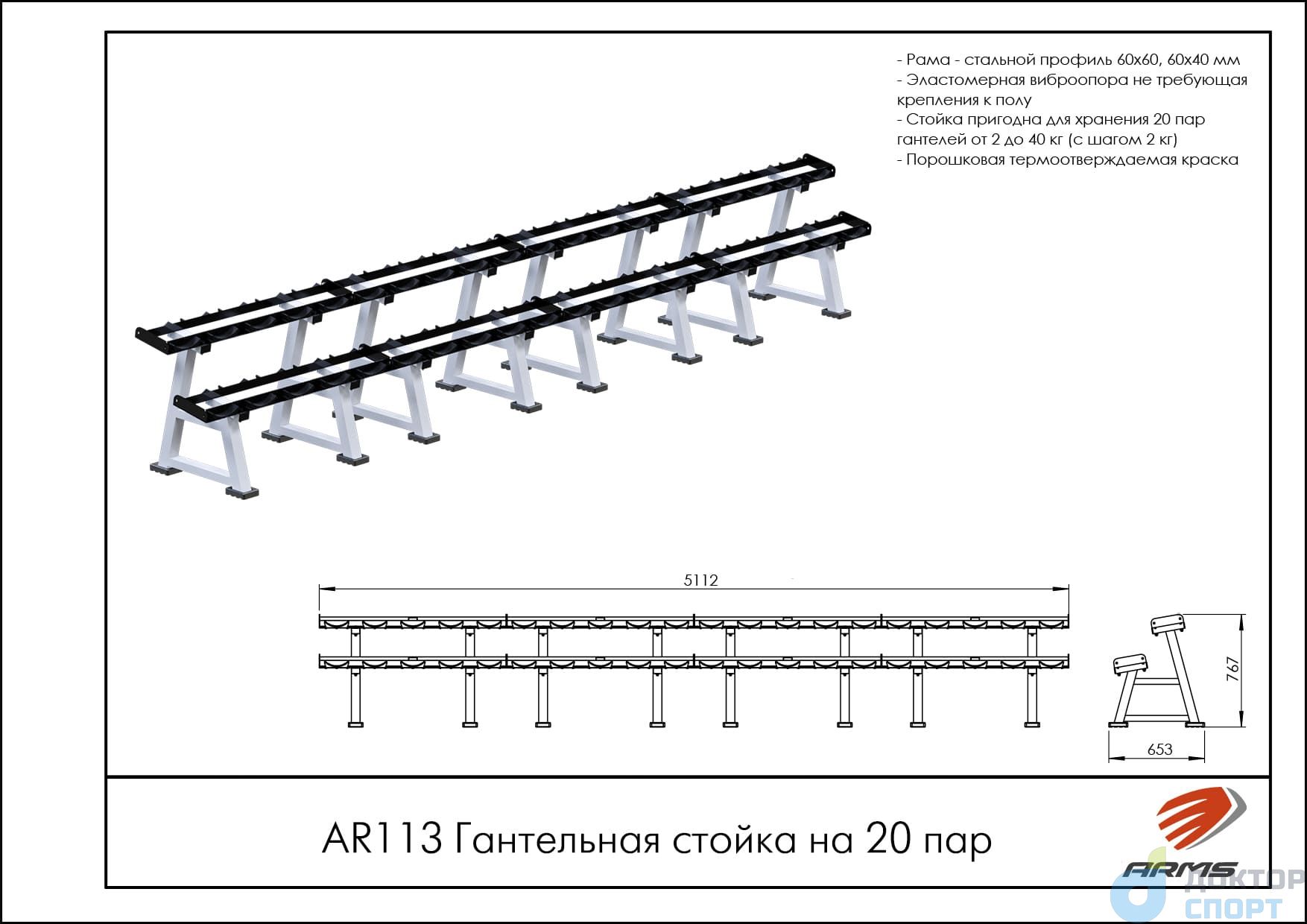 Предназначение: Двухъярусная стойка для хранения до 20 пар профессиональных гантелей ARMS. -