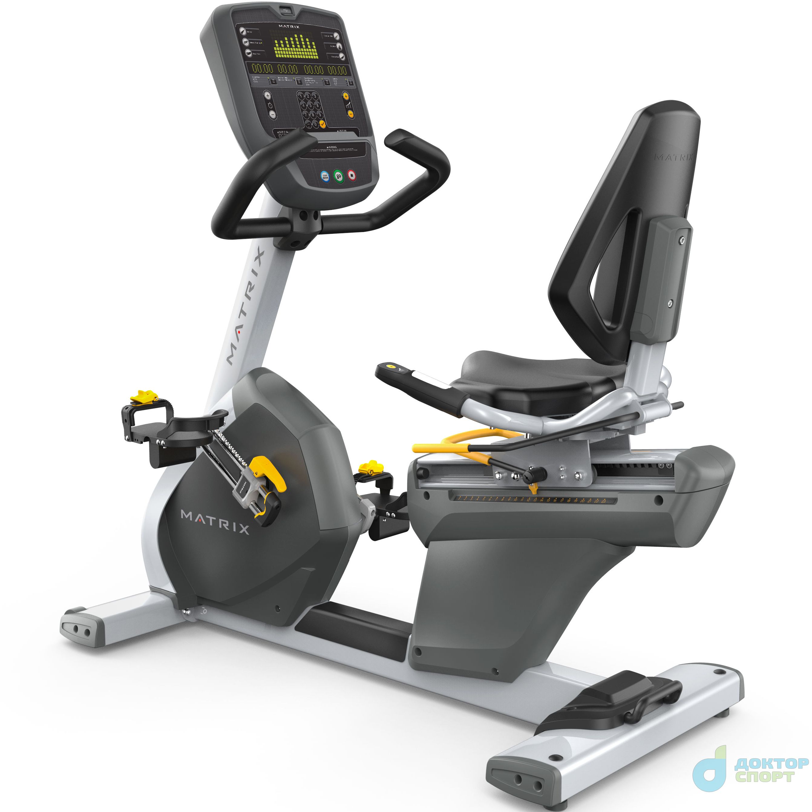 ?Горизонтальный велоэргометр R3XM - очередной инновационный продукт от Matrix. Тренажер предназначен для применения в лечебных и реабилитационных учреждениях, а также в центрах активного долголетия. Его главная особенность заключается в том, что сиденье можно вращать в диапазоне 160 градусов, и оно фиксируется в крайнем правом, центральном и крайнем левом положениях. Это очень удобно для малоподвижных пользователей, которые используют инвалидное кресло для передвижения. В дополнение к этому конструкция предусматривает простоту перешагивания, что облегчает вход и выход с тренажера. Для людей с ограниченным объемом движения в коленных или тазобедренных суставах предусмотрена возможность настройки длины шатунов педалей независимо друг от друга. Регулировку можно выполнить в диапазоне 3,8 – 17,8 см (1,5 – 7 дюймов) без использования дополнительных инструментов. Такая регулировка помогает пользователю выполнять вращательные движения без лишнего дискомфорта. Самобалансирующиеся педали с подпятниками и регулируемыми ремнями обеспечивают надежную и устойчивую фиксацию стопы. Более того, шатуны педалей фиксируются в пронумерованных положениях, что позволяет легко проверить правильность установки необходимой длины и четко контролировать тренировочный процесс. Консоль с ярким светодиодным дисплеем обеспечивает интуитивно понятное управление и отражает только ту обратную связь, которая необходима для работы физиотерапевтов и врачей клинических специальностей. Сеть Wi-Fi позволяет использовать опциональные функции, такие как: система управления оборудованием Asset Management и сеть отслеживания тренировок Workout Tracking Network. Благодаря наличию встроенной транспортировочной рукоятке и использованию бесщеточного JID™ генератора, нет никакой необходимости подключать тренажер к сети и его можно установить в любом желаемом месте. Бесшумная трансмиссия QuietGlide™, высококачественные шведские подшипники SKF и восьмижильный поликлиновый ремень создают идеально мягкий ход с равномерной нагрузкой по всему циклу вращения. -