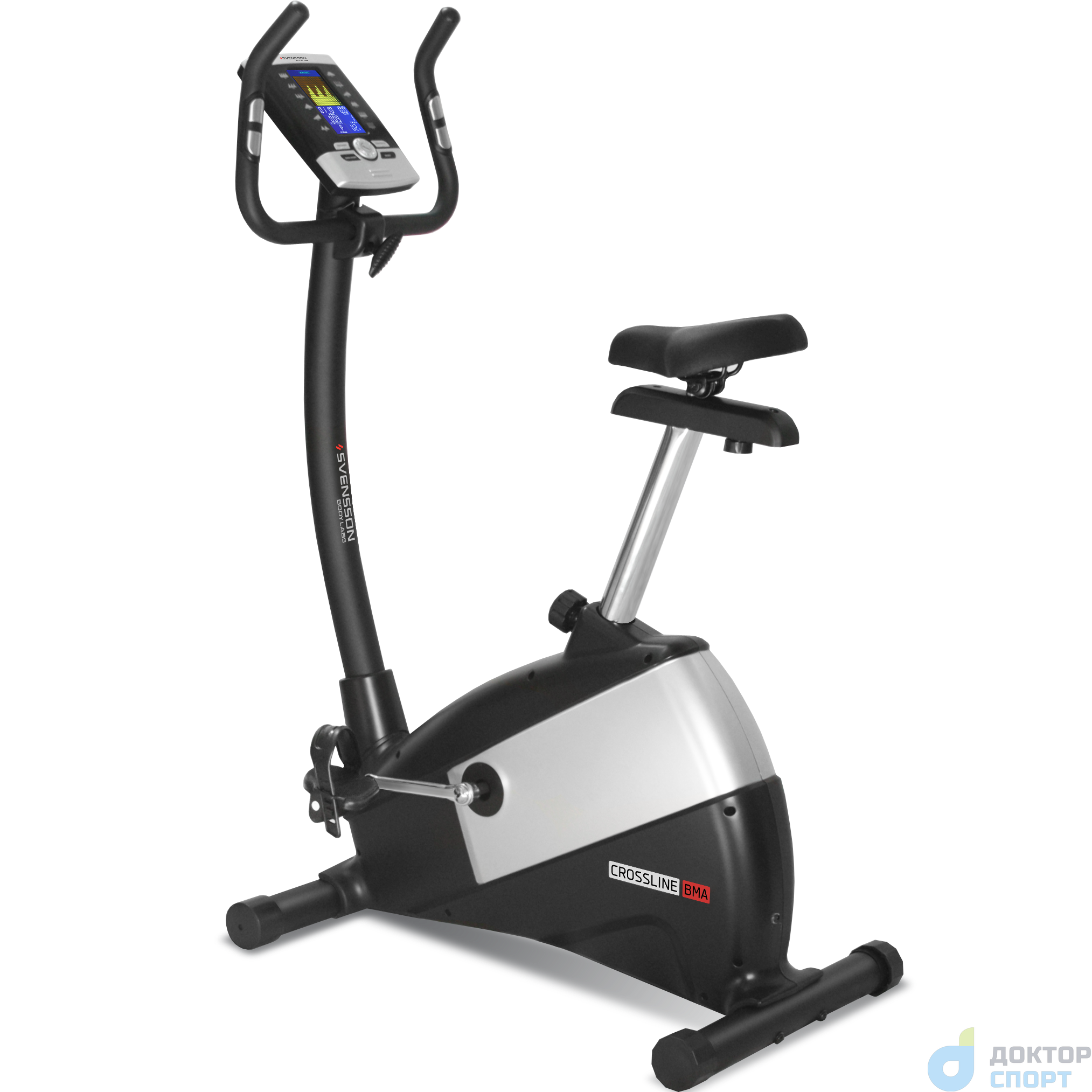 ?SVENSSON BODY LABS CROSSLINE BMA относится к числу премиальных велоэргометров. Конструкция рамы выполнена из высокопрочного профиля и выдерживает пользователя весом до 140 кг. Запатентованная приводная система электромагнитного типа SpinMaster EMS построена на основе утяжеленного сбалансированного маховика весом 11 кг, высокоточных шведских подшипников производства SKF и трехкомпонентного шатуна велосипедного типа. Связка этих компонентов обеспечивает самое плавное педалирование в широчайшем диапазоне нагрузок. К числу существенных биомеханических преимуществ относится возможность регулировки сидения не только в вертикальном, но и горизонтальном положениях, круговая регулировка положения руля, удобное эргономичное сидение анатомической формы и рифленые антискользящие педали с прорезиненными многопозиционными ремешками. Хромированный подседельный штырь не только защищает поверхность от царапин, но и придает тренажеру большую внешнюю эффектность.