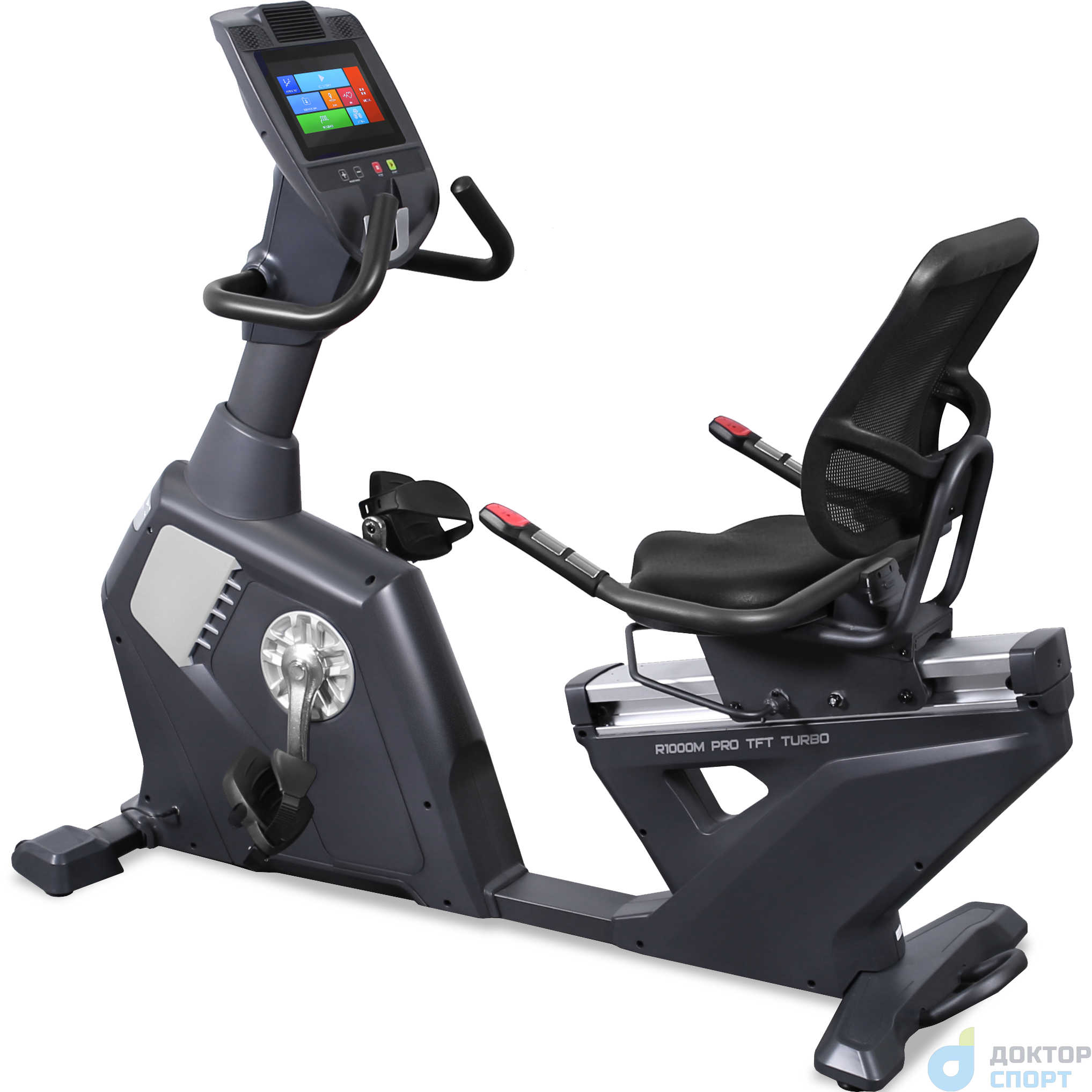 R1000M PRO TFT TURBO идеально подойдет для тех, у кого есть проблемы со спиной. Сиденье со спинкой профессионального класса имеет возможность горизонтальной регулировки. Широкое и очень мягкое, выполненное в анатомической форме с гелевыми вставками. Направляющая рельса сиденья сделана из алюминиевого сплава. Рифленые педали с прорезиненными многопозиционными ремешками создают надежное сцепление на любых скоростях. Велоэргометр удобно перемещать благодаря двум транспортировочным роликам и ручке, расположенной сзади, а точное горизонтальное положение обеспечивают компенсаторы неровностей пола. Максимальный вес пользователя - 180 кг.