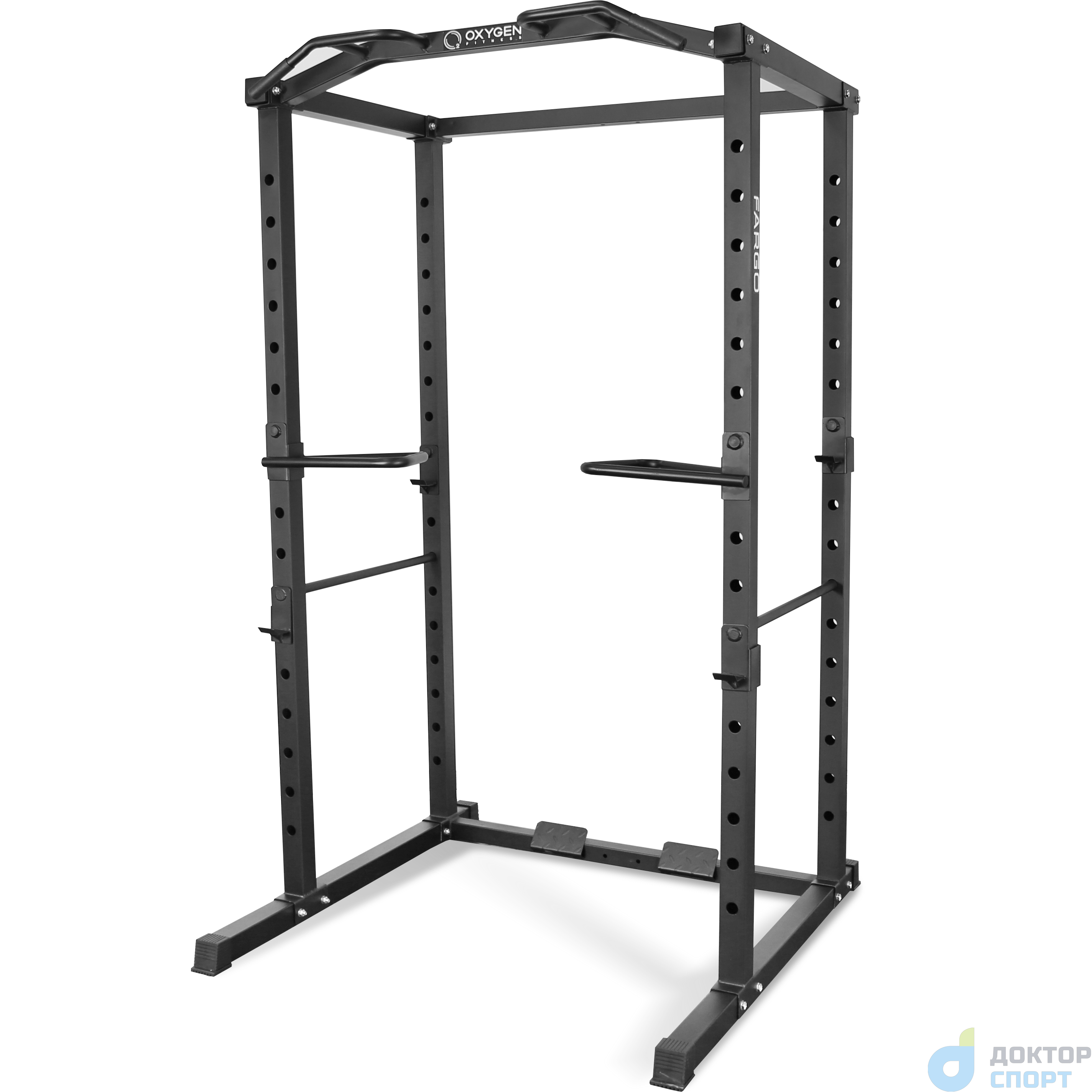 Конструкция силовой рамы FARGO включает в себя все необходимые элементы для детальной проработки различных групп мышц. Это съемные крюки для грифа, брусья, турники с многопозиционными хватами и зацепы для подтягиваний. Также для занятий без штанги предусмотрены зацепы для эспандеров. На стойках широкий диапазон отверстий с цифровой разметкой для комфортной и быстрой установки навесных элементов. Дополнительное оборудование для рамы (грифы, эспандеры, навесные элементы) приобретается отдельно.