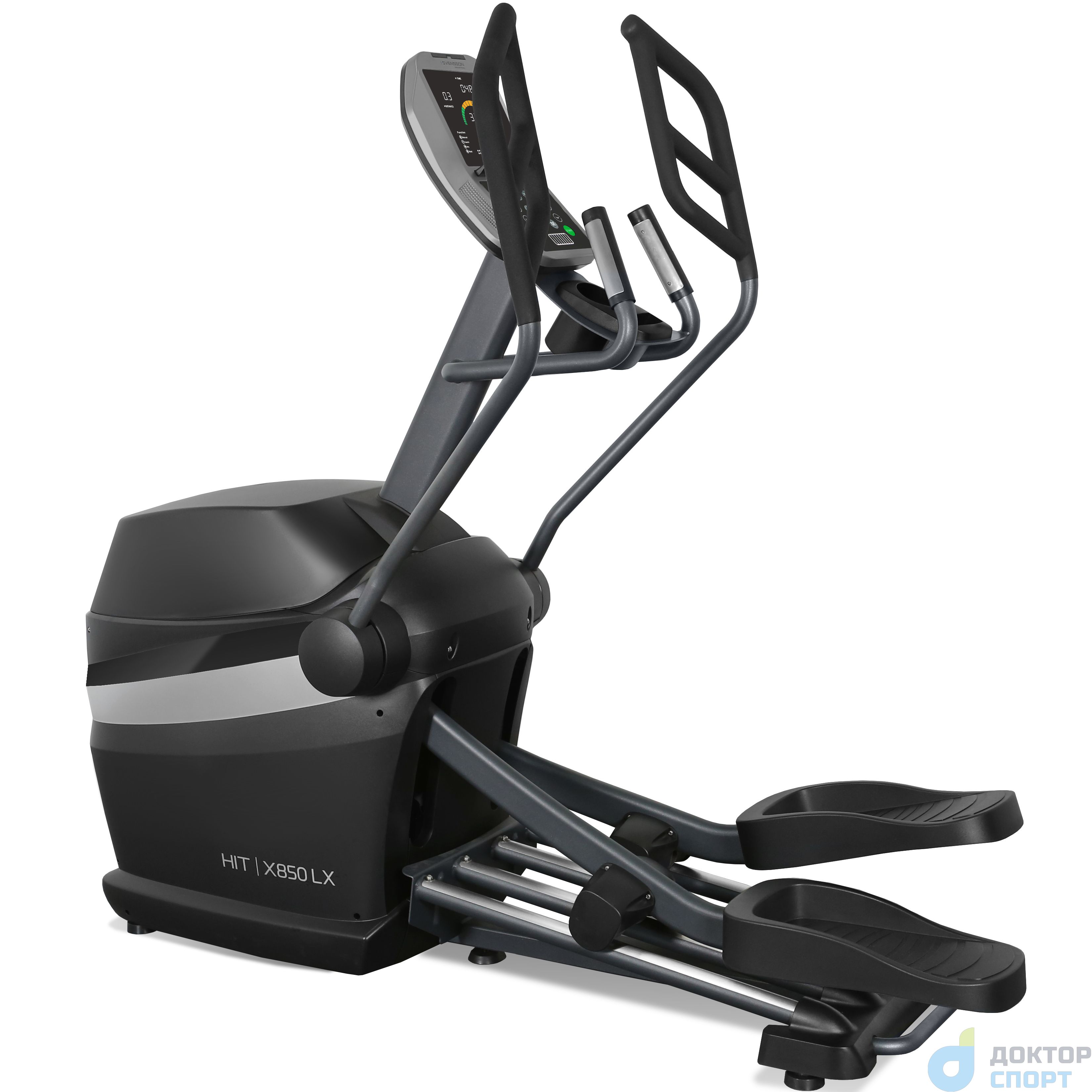 ?Серия HIT от Svensson Industrial, представленная моделями 850 и 850 LX* - премиальная профессиональная серия, рассчитанная на максимальные режимы коммерческой эксплуатации (heavy commercial). Произведенные на Тайване, тренажеры отличаются высоким качеством сборки, а также использованием самых надежных узлов и компонентов. Дизайн выполнен в традиционных для Svensson Industrial строгих и изящных формах. Высокий класс оборудования и его надежность подчеркивает черный матовый цвет с использованием хромированных и серебристых элементов. К числу основных преимуществ HIT X850 LX относится индукционная система нагружения (индукционный тормоз). На сегодняшний день это наиболее совершенная сиcтема нагрузки у вело- и эллиптических тренажеров. Торможение маховика происходит за счет магнитного поля, которое создается катушкой с поданным на неё электрическим током, расположенной в непосредственной близости от маховика. При увеличении силы тока в проводах катушки возрастает сила магнитного поля, и наоборот - при уменьшении силы тока поле ослабевает, за счет чего и происходит изменение нагрузки. Преимущества индукционного тормоза следующие. Во-первых, число взаимодействующих трущихся элементов сведено к минимуму, поэтому и общая надежность системы гораздо выше. Во-вторых, ход тренажера гораздо мягче и плавнее, уровень шума при этом ниже тренажеров с иной системой нагружения. В-третьих, индукционному тормозу (в связке с генератором) не нужно подключение к сети - а это экономия электричества и отстутствие лишних проводов. Помимо надежной высокотехнологичной системы нагружения, HIT X850 LX обладает рядом других важных преимуществ. С точки зрения биомеханики тренажер превосходно справляется со своими задачами. Передний привод с маховиком 30 кг обеспечивает правильную и естественную траекторию движения. Длина шага 53 см достаточна для комфортной эффективной тренировки. Расстояние между педалями (супермалый Q-Фактор E.S.Q.F. ) составляет всего 3 см - это это один из лучших показателей в отрасли и еще один плюс в копилку бимеханики HIT X850 LX. Безусловно, важна рама - иначе тренажер просто не выдержит высокоинтенсивных нагрузок. Эллипсоид построен с использованием сварного профиля максимальной прочности (Ultra Heavy Gauge Steel). Именно поэтому нетто вес изделия составляет внушительные 117 кг, а максимальный вес рассчитан на пользователей до 200 кг. Педальный узел построен на базе переднего привода и использует 4 рельсы для качественного и надежного скольжения педалей. Тренировочный компьютер представлен дисплеем профессионального уровня. Основной экран использует светодиоды (LED), а 4 дополнительных буквенно-цифровых экрана работают на жидких кристаллах (LCD). На экран компьютера выводятся все основные данные - профиль тренировки, скорость, дистанция, количество оборотов в минуту, калории, ватты и пульс. При желании можно воспользоваться одной из 12 предустановленных программ, рассчитанных на снижение веса, тренировку выносливости, скоростных качеств, реабилитацию и т.д. На отдельную клавишу консоли выведены 3 режима высокоинтервальных тренировок. Ватт-программы также разделены и активируются разными клавишами. В первом случае нагрузка в ваттах (в диапазоне от 10 до 500 ватт) выставляется перед тренировкой и сохраняется неизменной до ее окончания. Во-втором - это 6 программных профилей с изменя