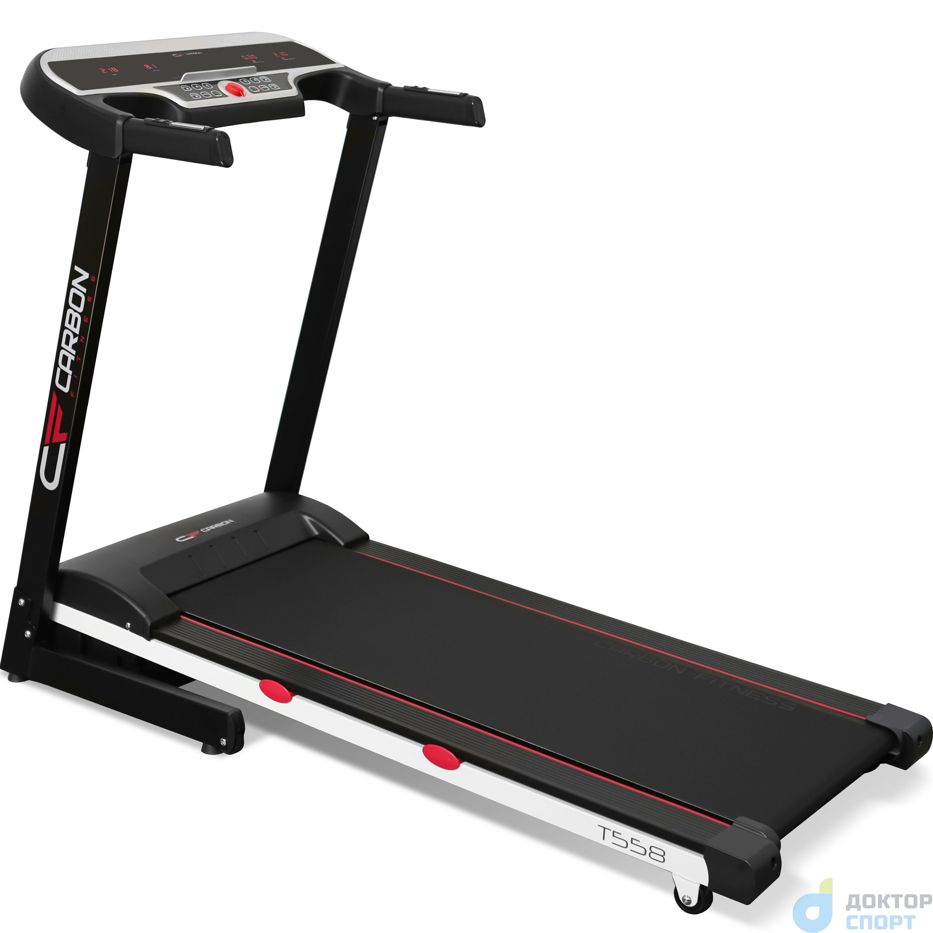 CARBON FITNESS T558 – современная беговая дорожка, предназначенная для использования в домашних условиях. Решить поставленные перед собой задачи может как новичок, так и опытный пользователь. Особое внимание уделено системе амортизации, которая создает повышенную комфортабельность во время тренировок. Модернизированные компоненты в составе 4 динамических эластомеров Variable Cushion System™ в сочетании с 4 амортизационными подушками Park-IN™ обеспечивают мягкость движения. Такой формат системы амортизации спроектирован для того, чтобы чувствовался ортопедический эффект, в значительной степени позволяющий снизить ударную нагрузку на суставы и позвоночник. Пользователи, имеющие проблемы с суставами, а также пожилые люди, без каких-либо опасений смогут выполнять базовые упражнения лечебной физкультуры. Режим средней мягкости направлен на понижение травмоопасности, и позволит любителям бега и ходьбы ощутить максимально приближенные условия занятий, как на специализированных покрытиях. Беговая дорожка в сложенном состоянии не занимает много места, достаточно освободить 68 см в длину и 70 см в ширину для хранения тренажера. Система складывания в формате двухфазной гидравлики (Easy Drop??) обеспечивает безопасность для пользователя и плавное опускание деки. Двигатель с мощностью в 1,75 л.с., разработанный американской компанией LEESON, позволяет беговой дорожке разгонять скорость до 12 км/ч, менять уровень наклона от 0 до 15 % и выдерживать вес пользователя до 120 кг. Размер бегового полотна 122*43 см считается наиболее оптимальным для комфортных занятий людей до 2-х метров ростом. Все показания тренировочного процесса размещены на 4 ярких LED-экранах. Данные видно при любом освещении. На выбор пользователя есть 12 встроенных программ, направленных на различные виды тренировки (легкий бег, бег трусцой, пересеченная местность, сжигание жира, аэробная, интервальная, холмы, горы, долина, подъем, выносливость, снижение веса). Каждый сможет самостоятельно отрегулировать тренировку в режиме ручной настройки, а система жироанализатора Body Fat позволит получить максимально точный процент доли жира в организме. Для измерения пульса пользователя установлены сенсорные датчики пульса, расположенные на ручках беговой дорожки. Там же пользователь сможет найти дополнительные кнопки переключения наклона и скорости. Такое расположение дополнительных кнопок регулирования установлено в целях удобства и безопасности, особенно во время занятий на высоких скоростях. Приятной опцией является подставка под телефон или планшет.