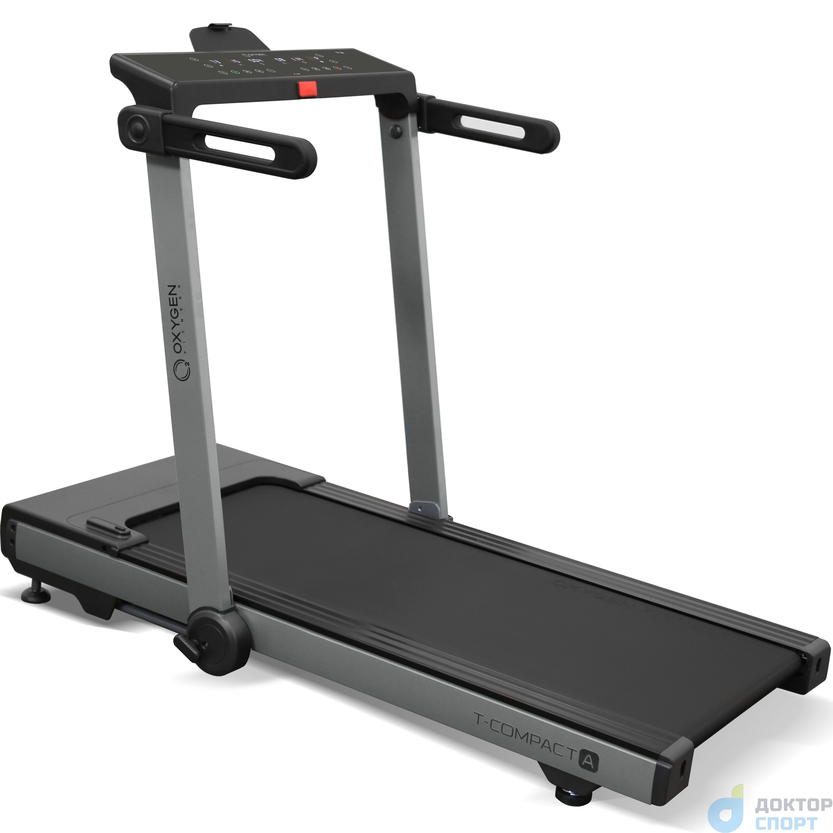 Созданная в традициях минимализма, серия беговых дорожек OXYGEN T-COMPACT сочетает в себе простоту, функциональность и комфорт. Тренажеры отличаются современным строгим дизайном, выполненным в элегантной цветовой гамме. Кроме аккуратно состыкованных поверхностей и гармоничного баланса металлических и пластиковых материалов, в серии T-COMPACT нет ничего лишнего. Моторный отсек является продолжением рамы деки, находится с ней на одном уровне и выглядит как единое целое. Такое решение придает не только эстетическую законченность форм, но и является одним из важных факторов, позволяющим уменьшить размер тренажера. Уникальная система складывания позволяет сэкономить максимум пространства в помещении - в сложенном виде толщина OXYGEN T-COMPACT составляет всего 22 см. Благодаря этому можно хранить дорожку под кроватью, на балконе или в кладовке. Тренажер легко перемещается в нужное место за счет 2-ух транспортировочных роликов. Значительно облегчает складывание и раскладывание беговой дорожки гидравлическая система safeFOLD. OXYGEN T-COMPACT поставляется в уже собранном виде и никакой инструментальной сборки не требует, ее просто нужно достать из коробки и подключить к розетке. Серия отличается шириной бегового полотна - для T-COMPACT A ширина составляет 50 см. Такие же размеры используются в дорожках, установленных в клубах. Особопрочная рама в сочетании с парафинированной декой 18 мм и наличием многослойного полотна Habasit NVT-220 (толщина 2.0 мм) позволяет оборудованию выдерживать вес до 120 кг. Формат закрытого типа рамы существенно сократит попадание пыли и грязи во внутренние части беговой дорожки. В OXYGEN T-COMPACT A установлен двигатель от американского производителя LEESON, его мощность составляет 2.25 л.с. в режиме постоянной эксплуатации. При пиковых нагрузках – 4.05 л.с. Такой показатель мощности позволяет достичь разгона скорости до 16 км/ч. Традиционно для OXYGEN FITNESS™ большое внимание уделено и амортизации. Впервые использована технология 3-Fold Flanks™, которая представляет собой 2 трехкомпонентных динамических эластомера. Дополнительно на дорожке установлены хорошо зарекомендовавшие себя плоские эластомеры Natural™ в количестве 4-х штук, а также 2 цилиндрических эластомера с пружинами Natural™ Springs. Наличие и разнообразие такой амортизационной системы не случайно. Связь всех элементов направлена на повышение комфорта пользователей и снижения жесткости беговой дорожки, что позволит сократить нагрузку и избежать проблем с суставами. Модель OXYGEN T-COMPACT A имеет весь необходимый набор для проведения эффективных тренировок. Информативная консоль с 6-ю яркими, буквенно-цифровыми LCD-дисплеями, отображает следующие показатели: калории, программы, время, расстояние, скорость и настройки. Все показатели изменяются при помощи сенсорных кнопок. В памяти консоли содержится 19 программ, 15 из которых помогут пользователям начать тренировочный процесс в независимости от их уровня подготовки (ходьба, быстрая ходьба, средний бег, бег трусцой, снижение веса, темповая тренировка, разминочный бег, подготовка к марафону, сжигание жира, аэробный бег, развитие скорости, интервальные тренировки, развитие выносливости, легкий бег, фартлек). Сделать упор на конкретный показатель можно при помощи режима целевых тренировок (дистанция, калории, время). Помимо установленных программ, можно воспользова