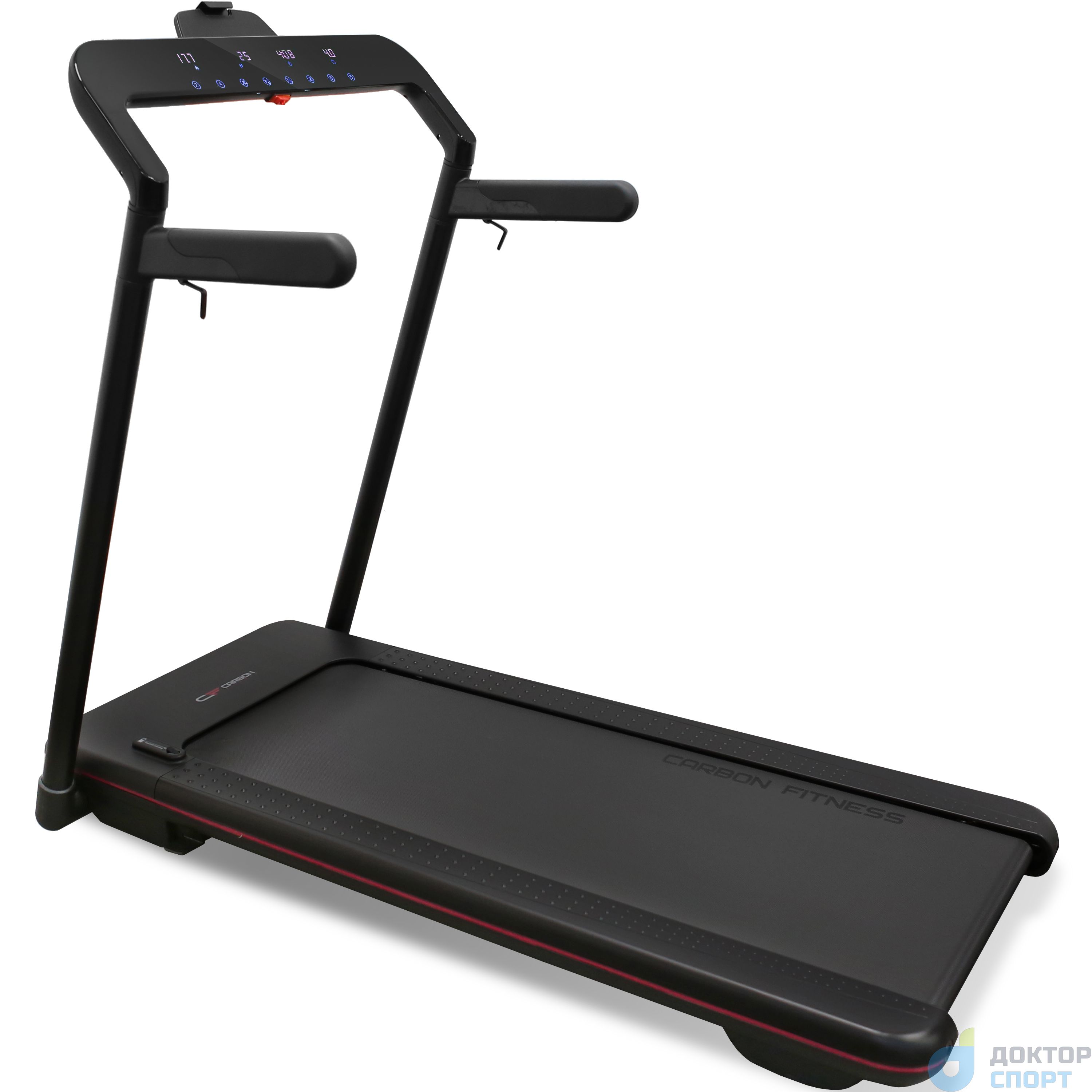 Carbon Fitness T708 SLIM – это гармоничное сочетание компактности и функциональности. Моторный отсек является продолжением рамы деки, находится с ней на одном уровне и выглядит как единое целое. Такое решение придает не только эстетическую законченность форм, но и является одним из важных факторов, позволяющим уменьшить размер тренажера. Толщина T708 SLIM в сложенном виде составляет всего 22 см. Дорожка легко помещается под кровать, в кладовку или любое другое небольшое место - хранить ее можно и в горизонтальном, и в вертикальном состоянии. Безусловным преимуществом является инновационная система FastAD™ - тренажер складывается и раскладывается простым способом при помощи одного рычага, на весь процесс уйдут считанные секунды. Значительно облегчает складывание и раскладывание беговой дорожки двухфазная гидравлическая система Easy Drop™. Carbon Fitness T708 SLIM поставляется в уже собранном виде и никакой инструментальной сборки не требует, тренажер нужно достать из коробки и подключить к розетке. T708 SLIM отличается широкой рабочей зоной для класса компактных беговых размеров – размер полотна составляет 124*46 см. Особопрочная рама в сочетании с парафинированной декой 18 мм и наличием многослойного полотна толщиной 1.8 мм позволяет оборудованию выдерживать вес пользователя до 120 кг. Формат закрытого типа рамы существенно сократит попадание пыли и грязи во внутренние части беговой дорожки. Несмотря на компактность, рабочий функционал T708 SLIM соответствуют всем общепринятым стандартам полноценной дорожки. А это значит, что на тренажере можно заниматься не только ходьбой, но и беговыми тренировками. На T708 SLIM установлен двигатель американской компании Leeson, его мощность составляет 2.25 л.с. в режиме постоянной эксплуатации. При пиковых нагрузках – 4.05 л.с. Такой показатель мощности позволяет достичь разгона скорости до 16 км/ч. Важной особенностью модели является ее амортизация. В отличие от большинства компактных беговых дорожек, в T708 SLIM амортизационная система выполнена на совесть и обеспечивает самые комфортные условия для тренировок пользователей начального и среднего уровня спортивной подготовки. На беговой дорожке использованы профессиональные динамические амортизаторы ABS™ Pro в количестве 4-х штук. На задней части деки установлена система Soft LEG™. Данный элемент амортизации одновременно выполняет и функцию ножек тренажера. Резиновая основа защищает напольную поверхность от нежелательных царапин, а также уменьшает издаваемые дорожкой шумы, которые образуются во время занятий. Связь всех элементов направлена на повышение комфорта пользователей и снижения жесткости беговой дорожки, что позволит сократить нагрузку и избежать проблем с суставами. Модель Carbon Fitness T708 SLIM имеет весь необходимый набор для проведения эффективных тренировок. Информативная консоль с 4-мя яркими буквенно-цифровыми LCD-дисплеями, отображает следующие показатели: расстояние, калории, шагометр, время, скорость. Все показатели изменяются при помощи сенсорных кнопок. В памяти консоли содержится 19 программ, 15 из которых помогут пользователям начать тренировочный процесс вне зависимости от их уровня подготовки. Сделать упор на конкретный показатель можно при помощи режима целевых тренировок (дистанция, калории, время). Помимо установленных программ, можно воспользоваться регу