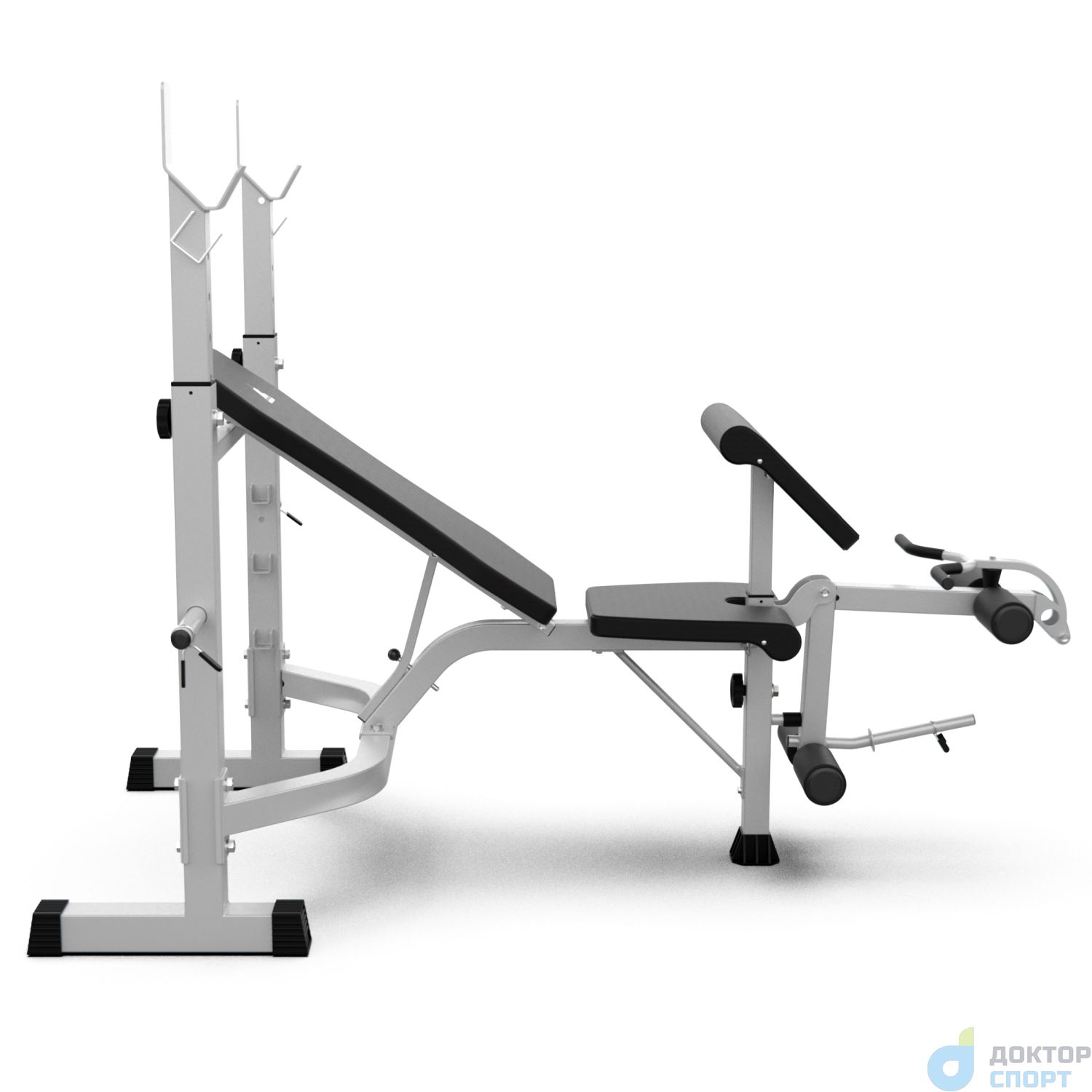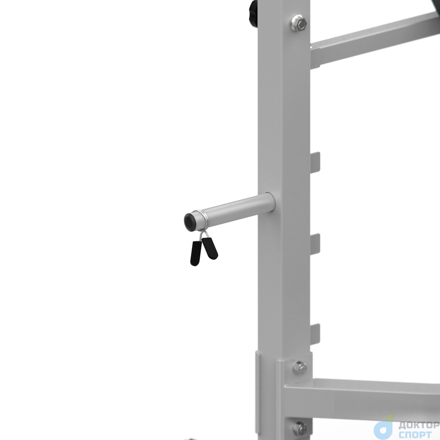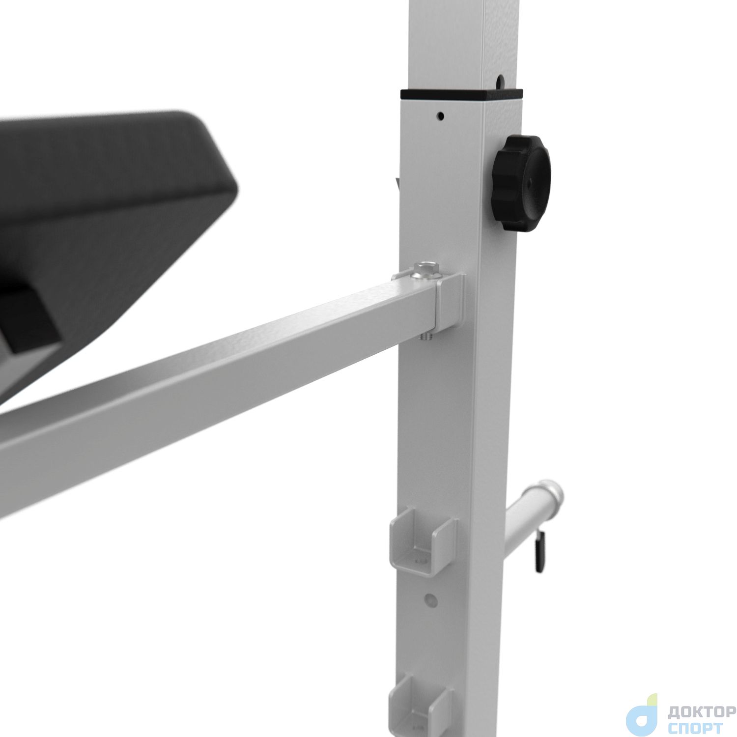 Максимальная нагрузка на стойки допустима до 100 кг. Стойки с металлическими замками для грифа регулируются по высоте на 5 уровней от 107,5 до 129,5 см с шагом 5,5 см.