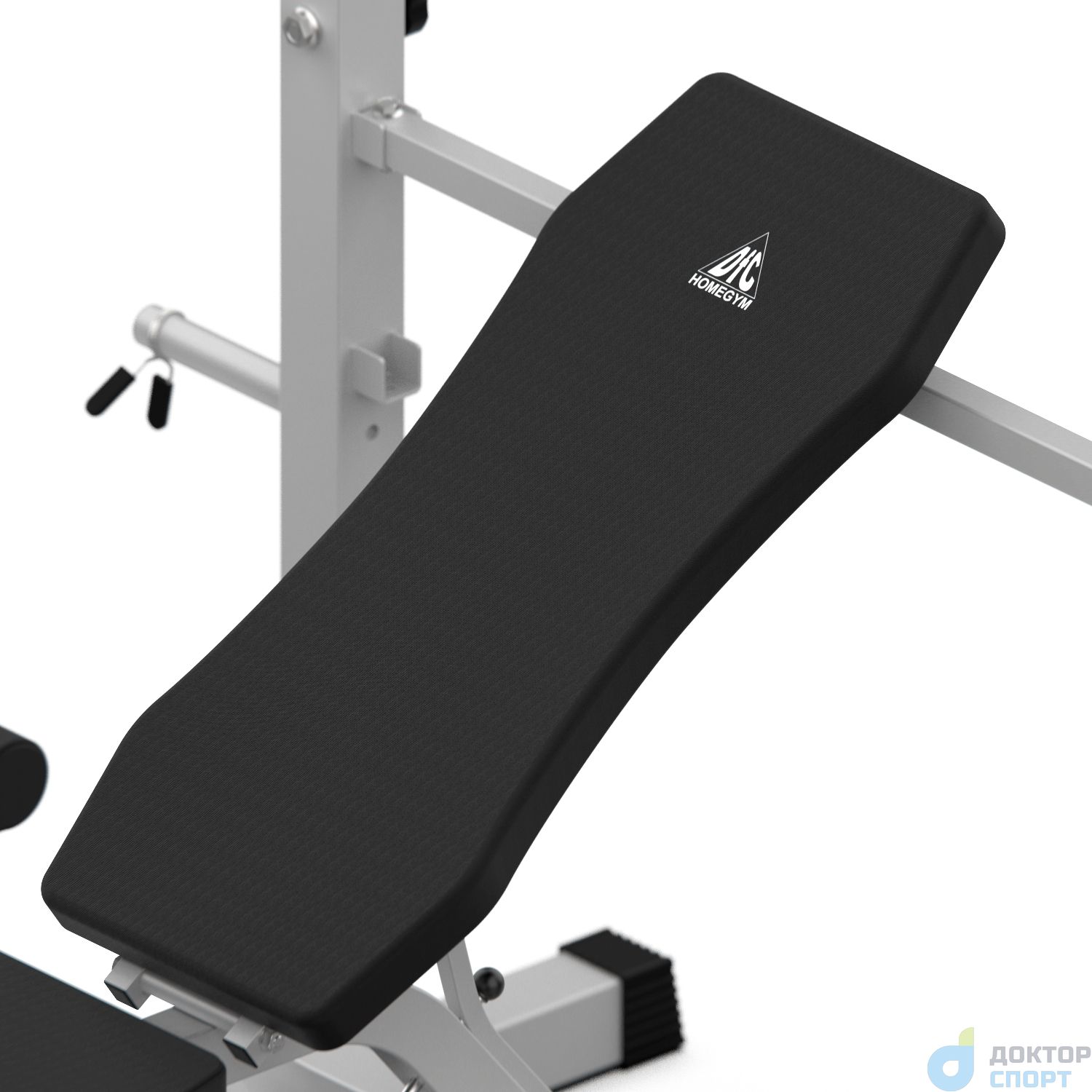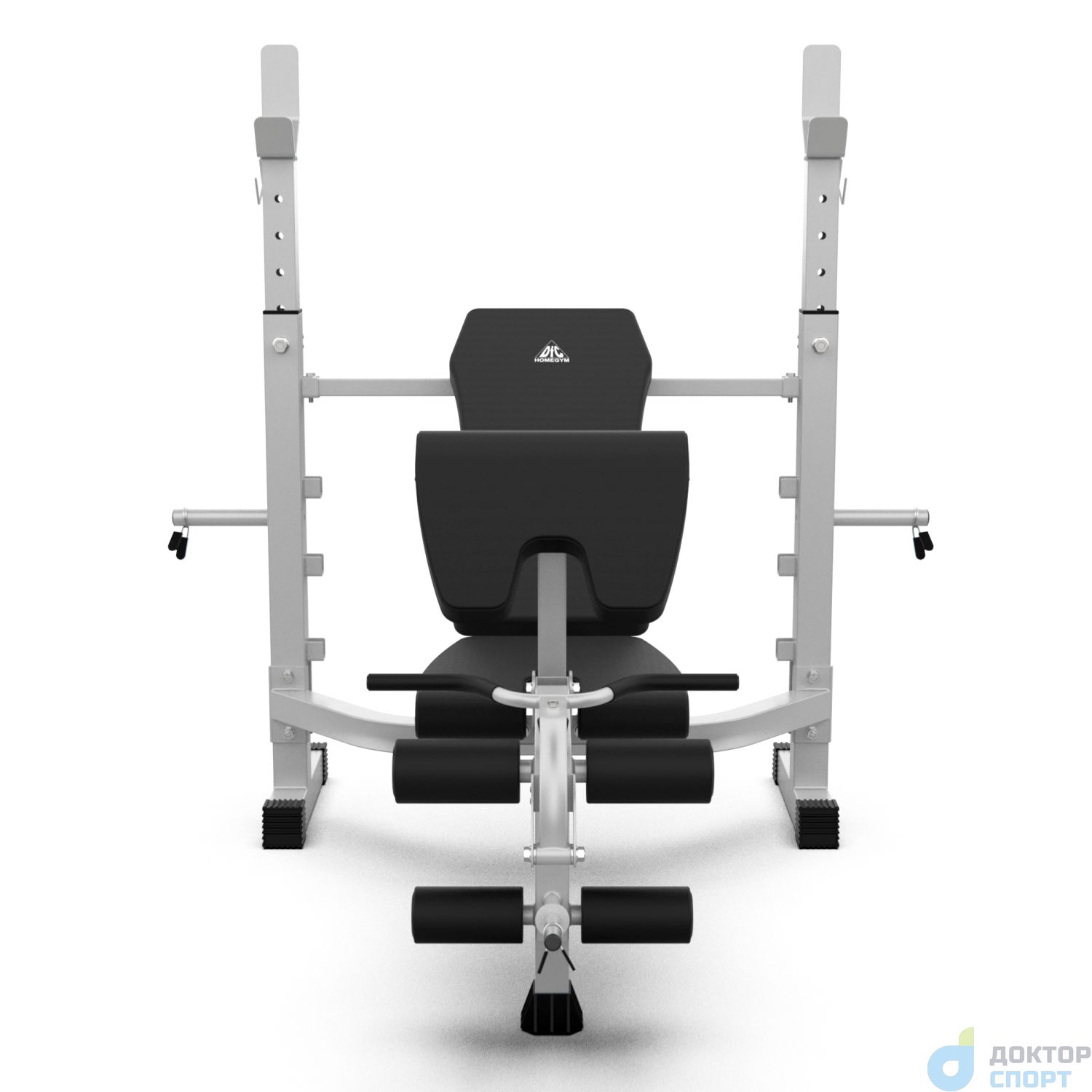 Универсальная скамья со стойками под штангу DFC D745 - следующая ступень в серии D740. Её стойки регулируются по высоте, в комплект поставки входят парта для бицепса и ручка для тяги. В качестве утяжелителя используются диски диаметром 26 мм (приобретаются отдельно). Максимальная нагрузка на стойки допустима до 100 кг. Стойки с металлическими замками для грифа регулируются по высоте на 5 уровней от 107,5 до 129,5 см с шагом 5,5 см. Скамья размерами 81 х 34 х 4,5 см регулируется на 4 уровня по углу наклона: 180°, 28.3°, 40°, 65°. Максимально допустимая нагрузка на скамью составляет 140 кг. Высота от сиденья до пола составляет 49 см. Парта для бицепса размерами 28 х 34 - 44 х 4,5 см регулируется по высоте на 3 уровня. Максимальная нагрузка на парту - до 70 кг. Съёмная ручка длиной 31,6 см и шириной 59,5 см с нескользящими накладками используется для упражнений на бицепс. Валики длиной 18 см используются для прокачки ног. Внешний диаметр валиков - 9 см, внутренний - 2,3 см. Длина держателя для дисков 21 см. -