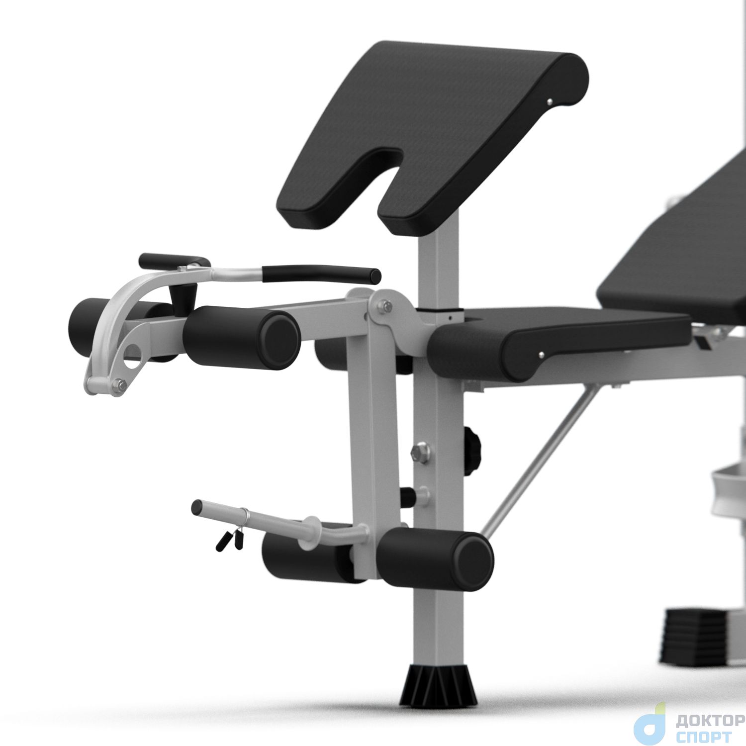 Съёмная ручка длиной 31,6 см и шириной 59,5 см с нескользящими накладками используется для упражнений на бицепс. Валики длиной 18 см используются для прокачки ног. Внешний диаметр валиков - 9 см, внутренний - 2,3 см. Длина держателя для дисков 21 см.