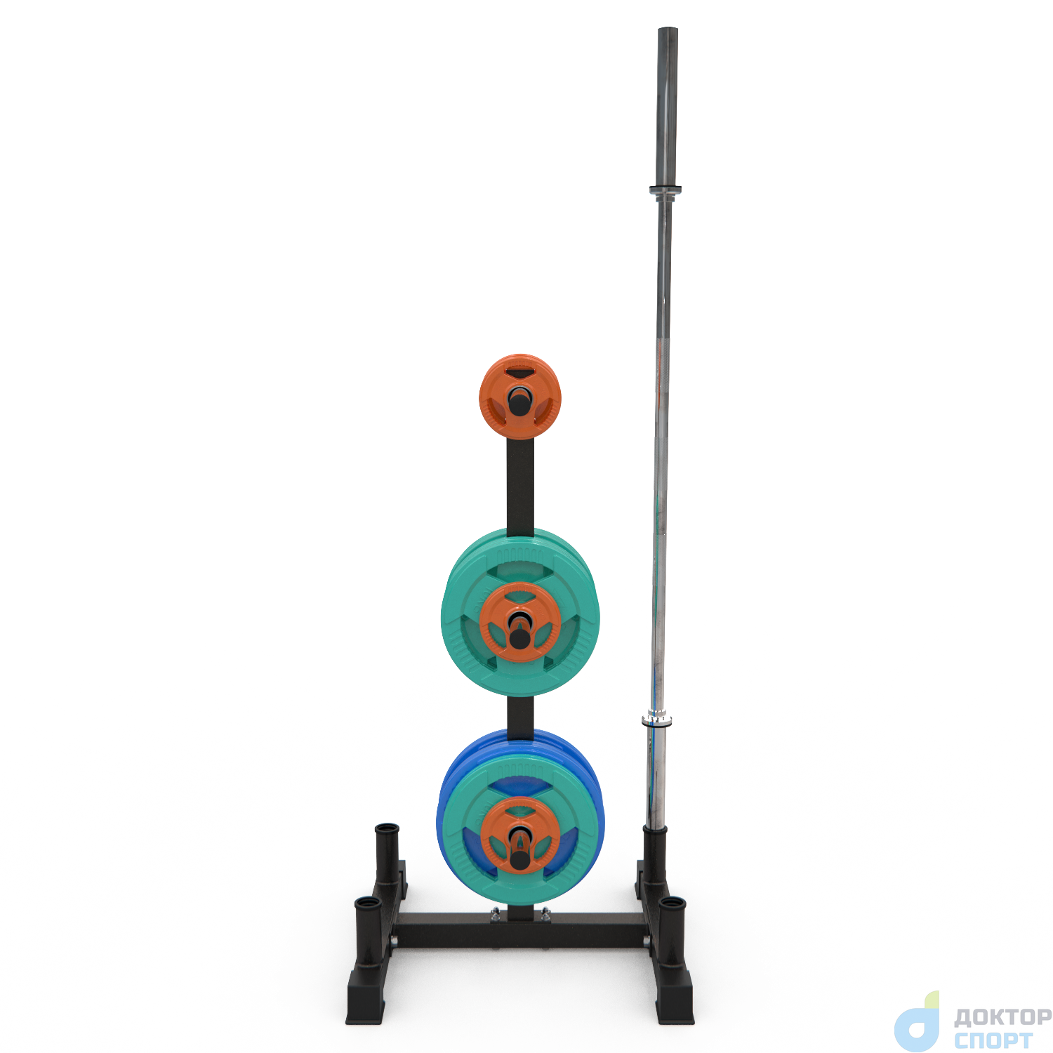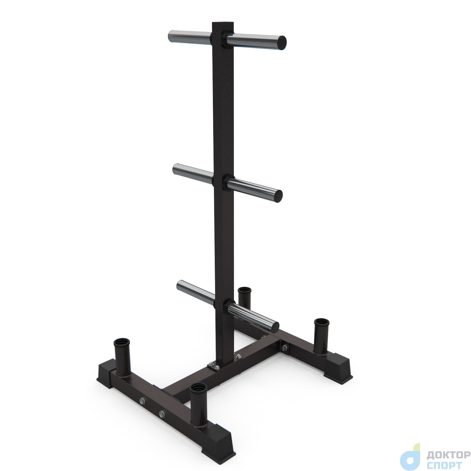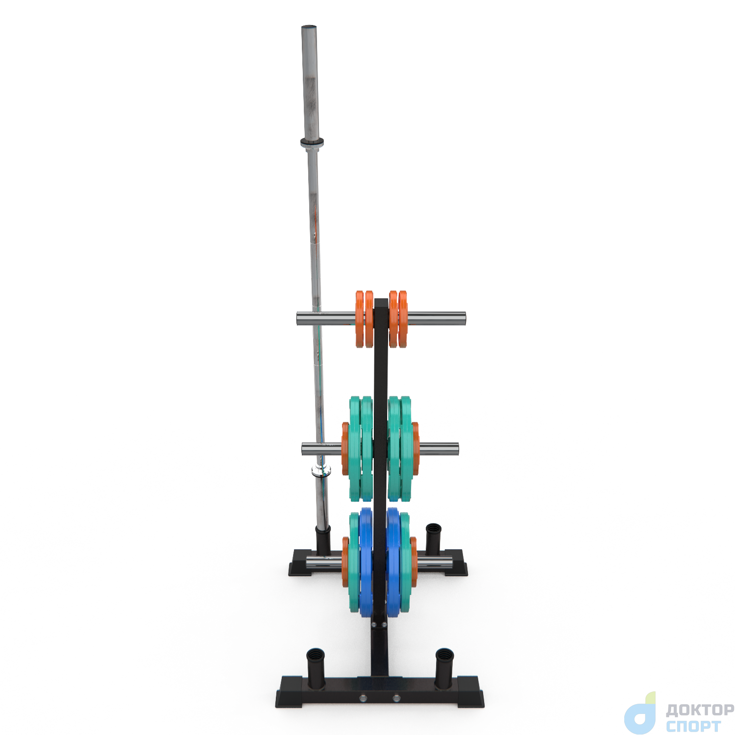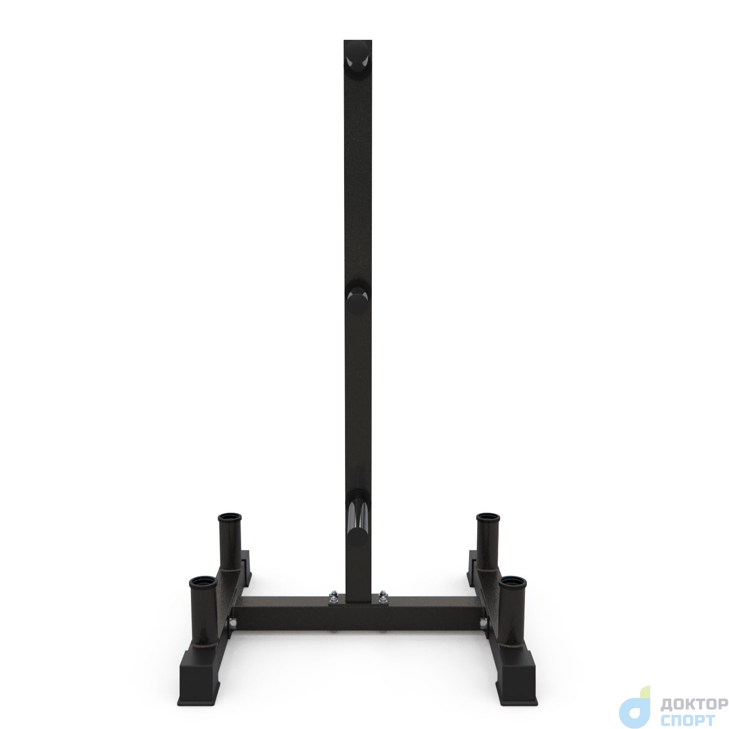 Стойка для хранения дисков и грифов DFC D875. Максимальная нагрузка до 100 кг, профиль основной рамы 50х50х2 мм. Подходит для дисков диаметром 51 мм, длина посадочного места 22,5 см. Расстояние между держателями дисков составляет 48 см в высоту. -
