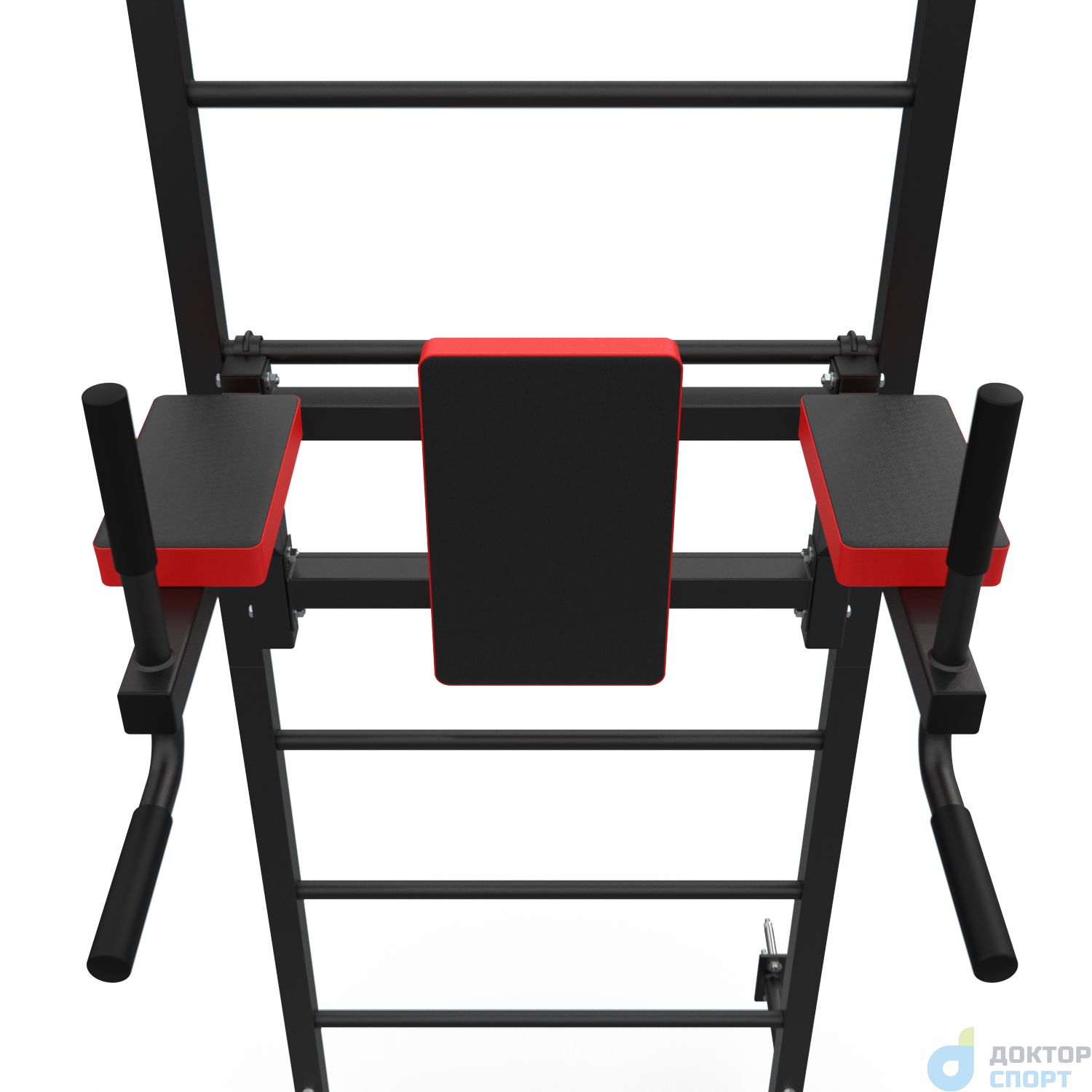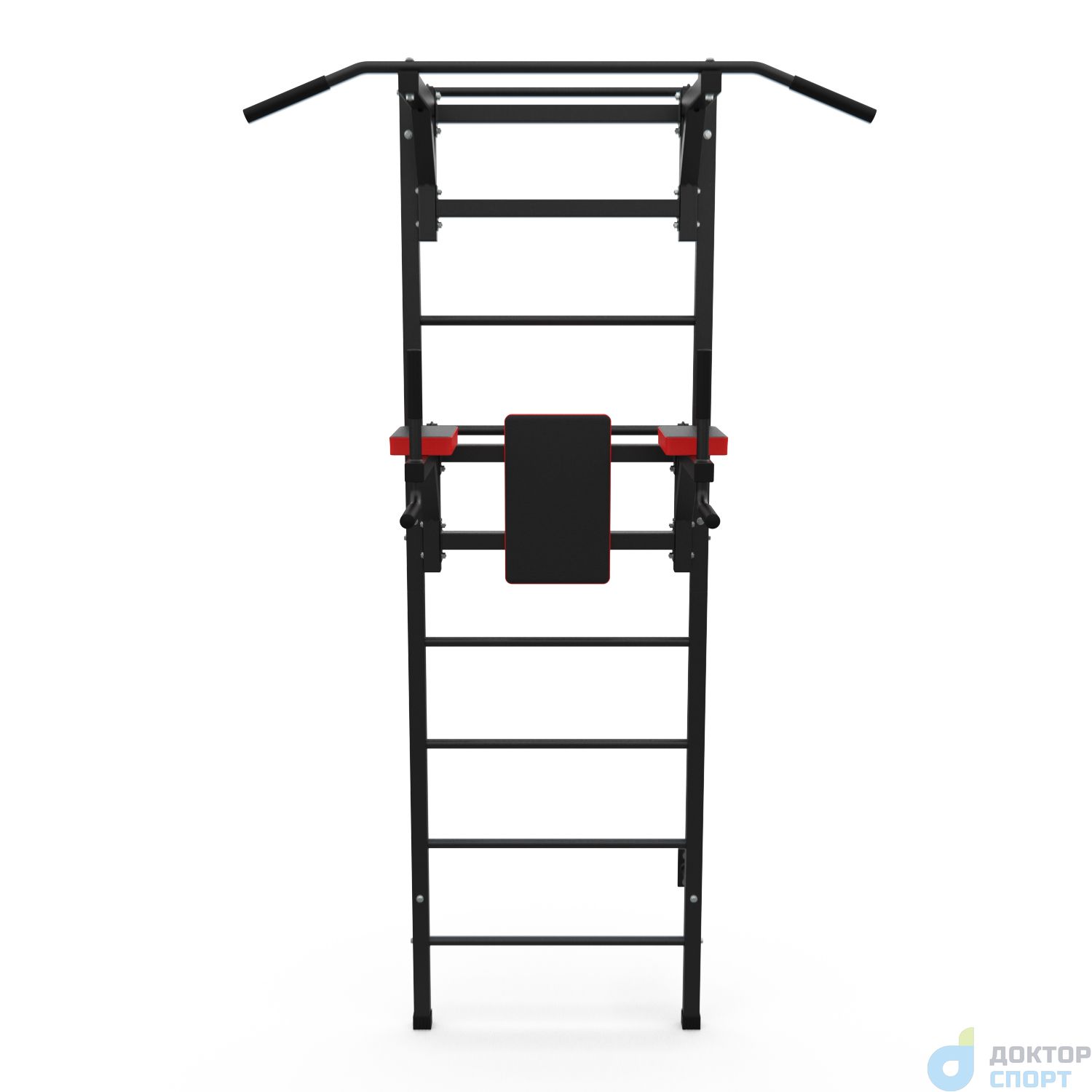 Турник длиной 99 см оснащён мягкими неопреновыми ручками, очень легко перевешивается на перекладины шведской стенки, что позволяет менять его высоту. Расстояние от ручек турника до шведской стенки (вынос турника) - 72 см. Вынос брусьев – 87 см, размер подушки под спину 42 х 25 см, а её толщина 5 см. Подушки подлокотников размерами 25 х 13 х 5 см, а поручни длиной 32 см диаметром 25 мм и толщиной стали 1,5 мм.