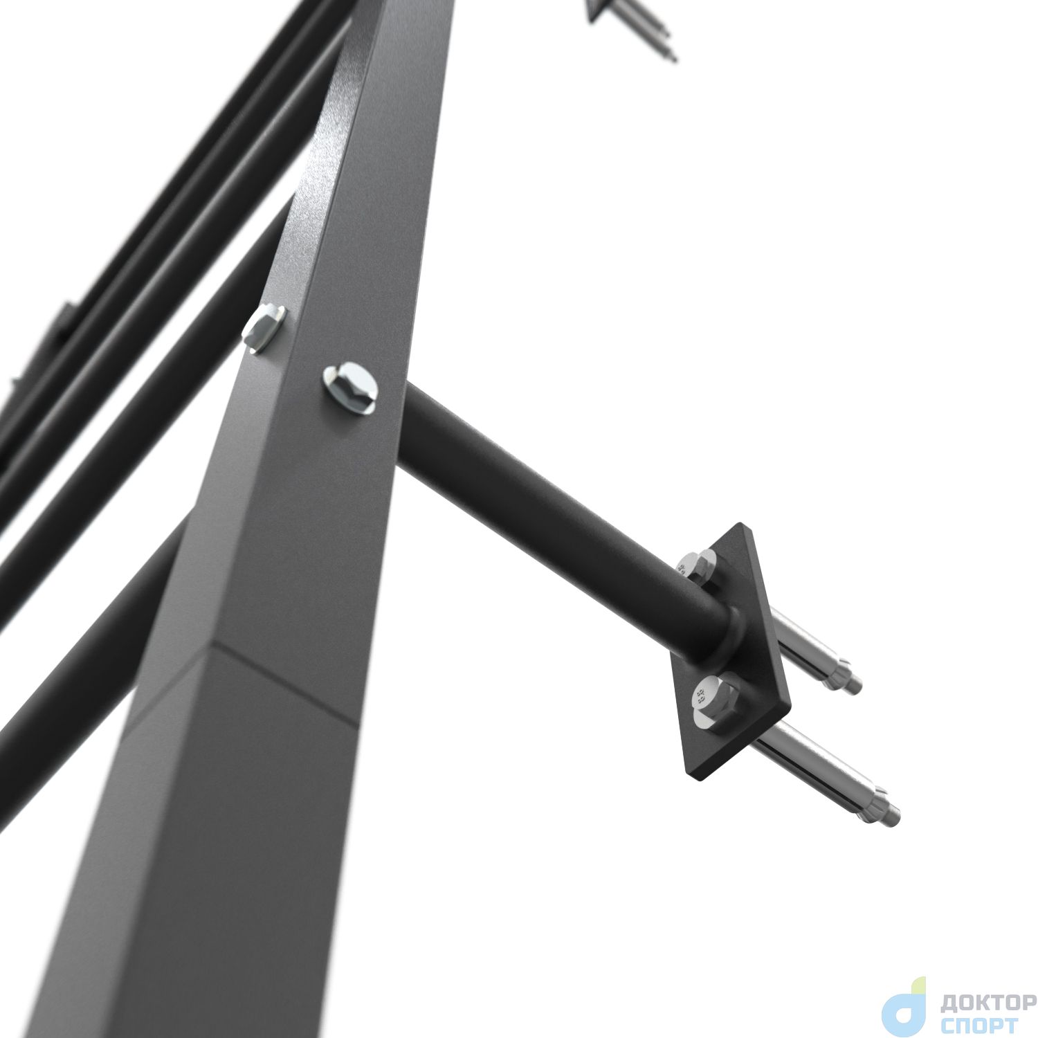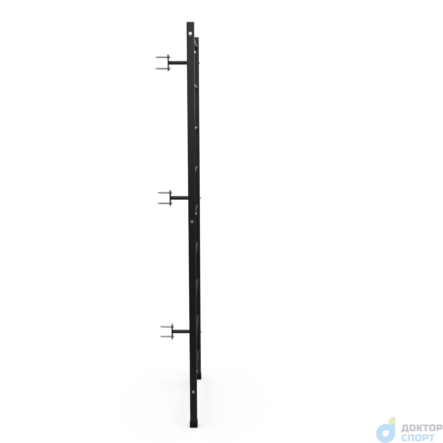 Сама стенка компактная: её высота составляет 231 см, а ширина всего 70 см. Расстояние от стены до стоек шведской стенки - 16 см. Расстояние между стойками диаметром 50 мм и толщиной 1,2 мм составляет 60,5 см, что является и шириной девяти перекладин диаметром 25 мм.