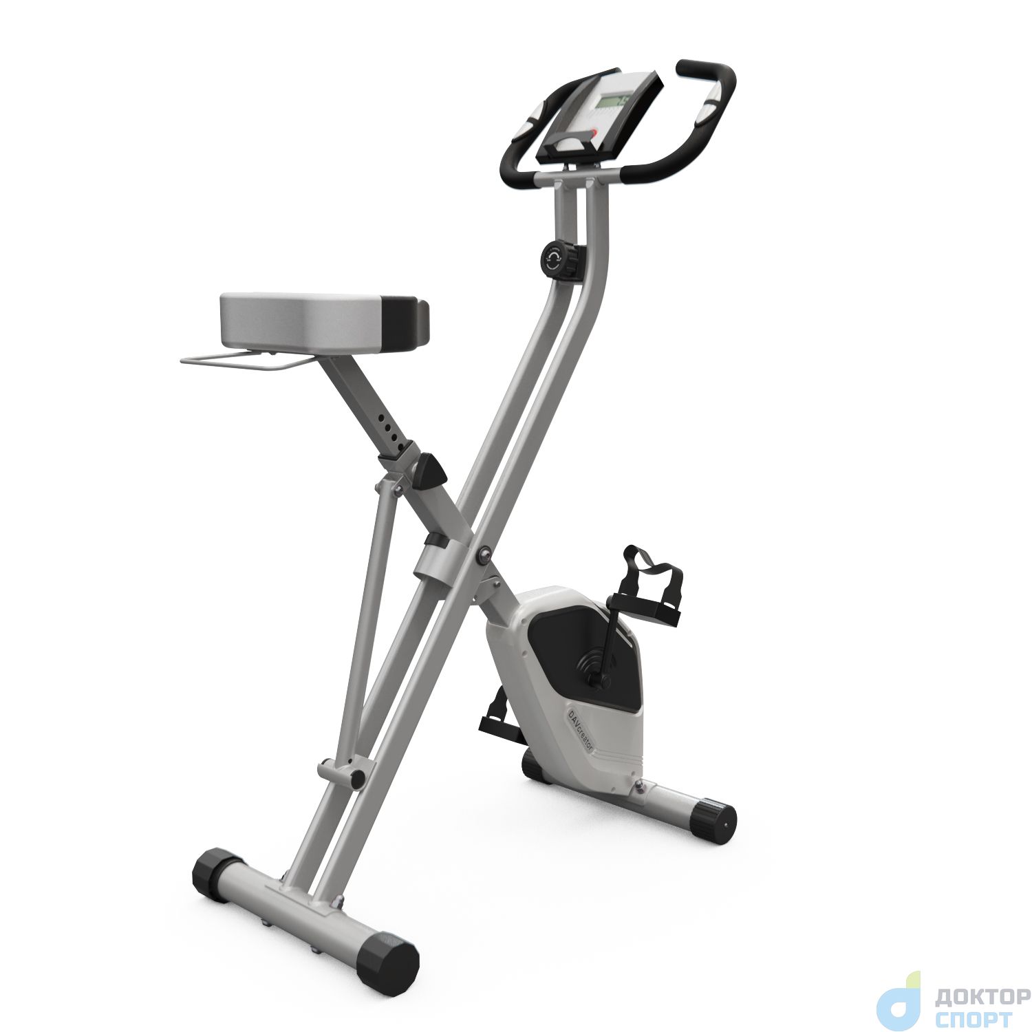 Велотренажер X-Bike DFC DavCreator серо-белого цвета, рассчитанный на пользователей весом до 110 кг. Такой цвет универсален и подойдет практически для любого интерьера. Нагрузка у тренажера магнитная с использованием инерционного маховика весом 3 кг. Имеется 10 уровней механической регулировки нагрузки, что позволяет пользователям выбирать оптимальный уровень сложности тренировки. Конструкция велотренажера складная, что позволяет легко его хранить и транспортировать. Сиденье оснащено держателем для полотенца - это очень удобно для пользователей. Тренажер оборудован компенсаторами неровностей пола для стабилизации и карманом для хранения мелких предметов. Велотренажер оборудован дисплеем, на котором отображаются основные параметры тренировки: сканирование, скорость, дистанцию, время, количество калорий, одометр (общий пробег) и пульс. Пульсовые датчики расположены на поручнях, что позволяет контролировать частоту сердечных сокращений в процессе тренировки. -