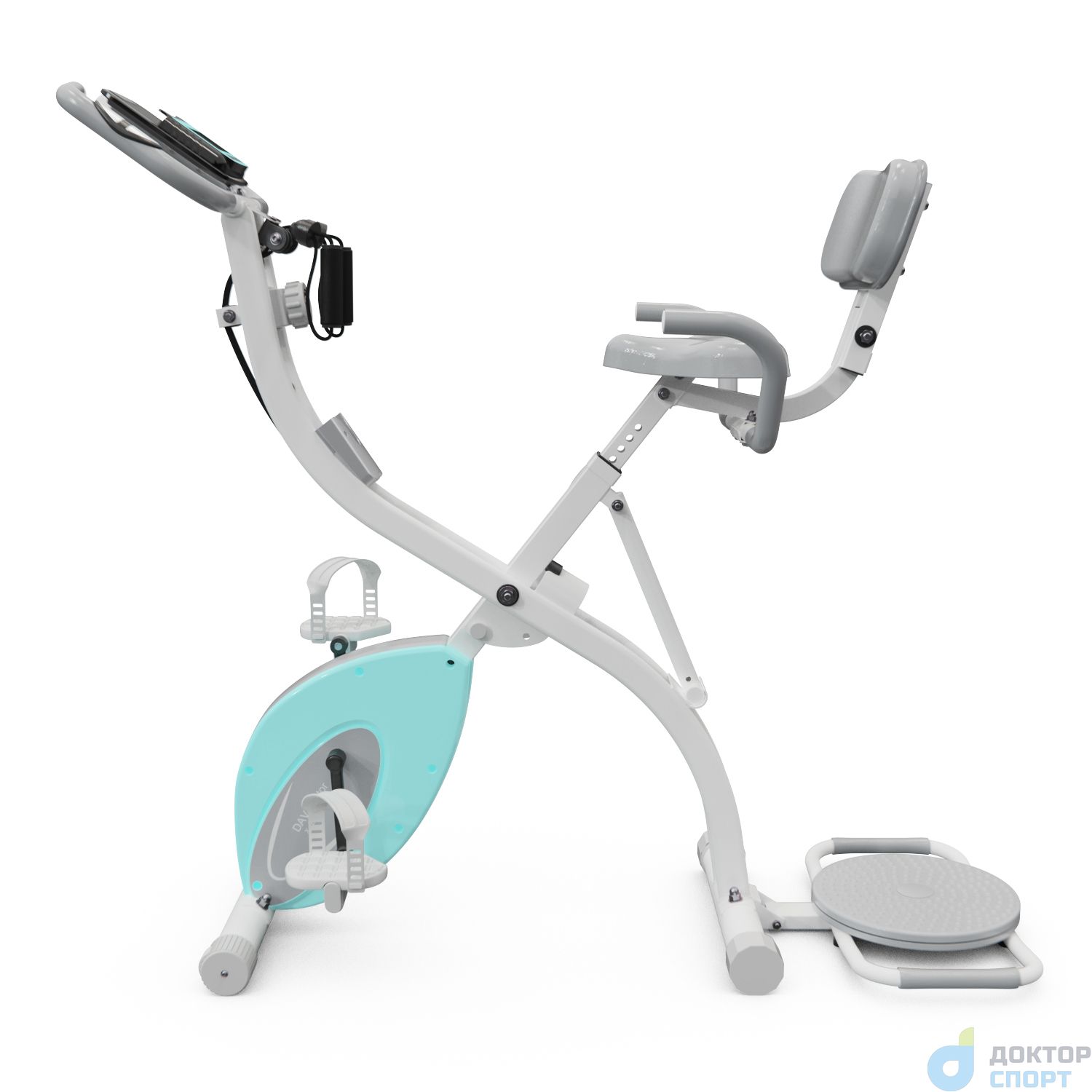 Велотренажер от DFC X-Bike DavCreator в красивом бело-голубом цвете. Он рассчитан на пользователей весом до 110 килограммов, что делает его подходящим для большинства людей. X-Bike имеет магнитную систему нагрузки, а инерционный вес его маховика составляет 3 килограмма. Механическая регулировка позволяет настроить нагрузку на 10 разных уровней, чтобы каждый пользователь мог подобрать оптимальный для себя режим тренировки. Одной из особенностей этого велотренажера является его удобная складная конструкция. Сиденье обладает спинкой и поручнями для комфорта пользователя, а также имеет карман для хранения гаджета. Также в комплект входит твистер, который можно использовать для дополнительной тренировки пресса. Дисплей этого велотренажера отображает важную информацию о тренировке, включая дистанцию, время, калории, одометр и пульс. Датчики пульса встроены в поручни, что обеспечивает удобство контроля за частотой сердечных сокращений. Для работы дисплея требуются батарейки типа AAA. -