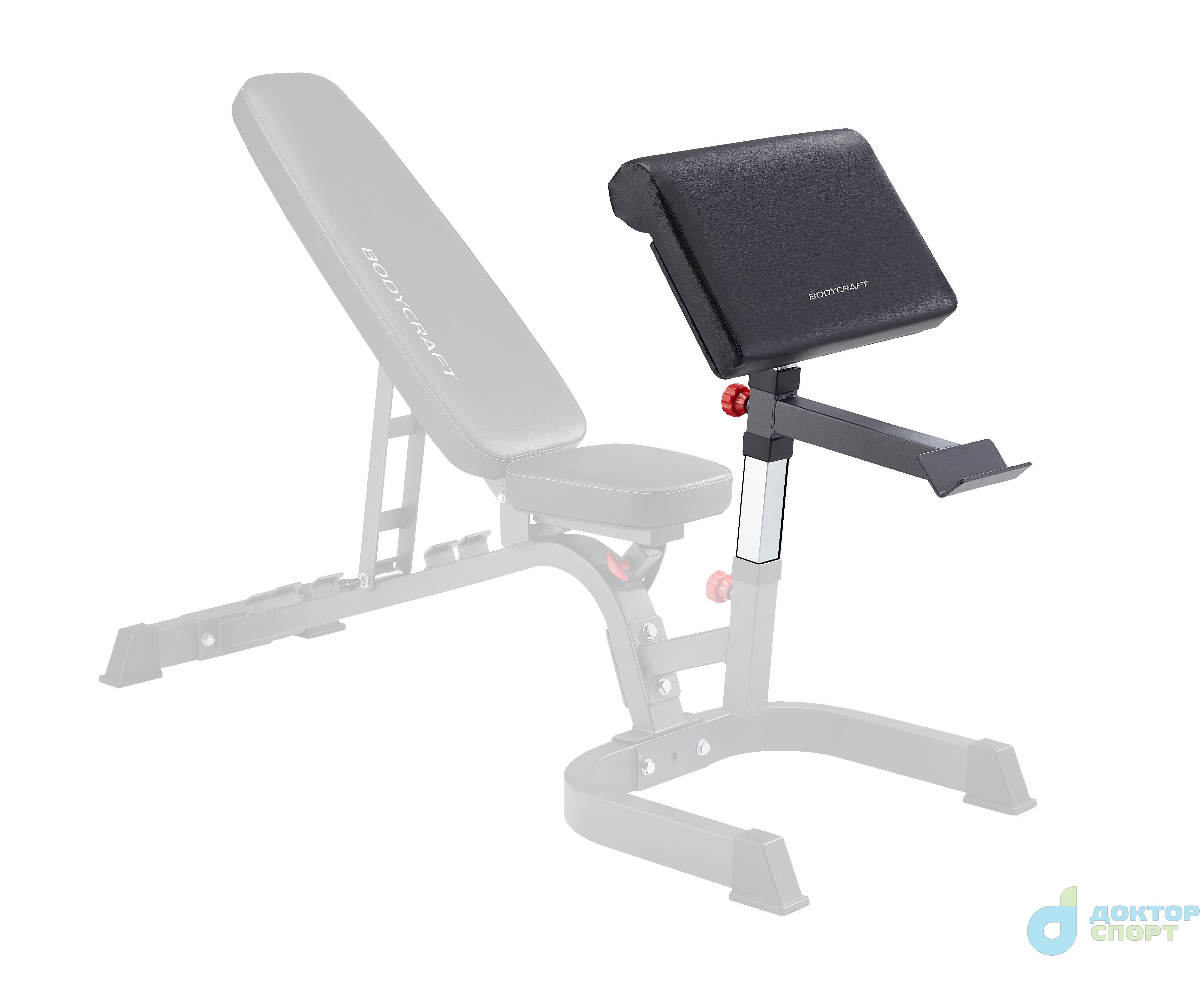 Вместе с силовой скамьей идет упор для ног с двумя валиками, который поможет вам лучше контролировать движения и сосредоточиться на выполнении упражнений. В комплект также входит парта для бицепсов BODYCRAFT F610, которая легко устанавливается, снимается и хранится. Она обита мягким и долговечным винилом и имеет пять уровней высоты. С её помощью пользователь сможет выполнять различные упражнения на бицепс, включая сгибание рук со штангой и с гантелями, а также разгибание рук с использованием снарядов. Это помогает разнообразить тренировочный процесс и увеличить эффективность занятий. Кроме того, в конструкции парты предусмотрен амортизатор для штанги, делающий занятия более безопасными.