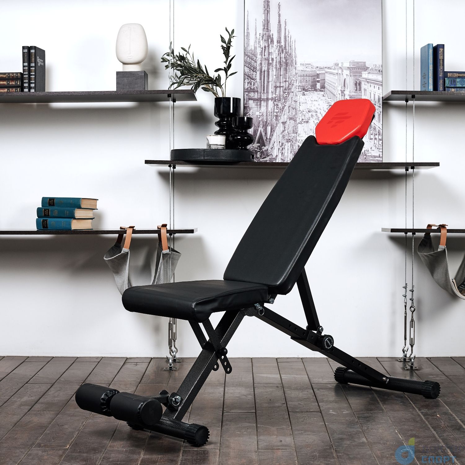 Функциональная и стильная скамья предназначена для домашнего использования. Имеет необычный дизайн: подголовник имеет ярко-красный цвет. Остальная конструкция выполнена в чёрном цвете. Такой дизайн подойдёт как для небольшого домашнего фитнес-зала, так и впишется в интерьер любой комнаты в доме или квартире.