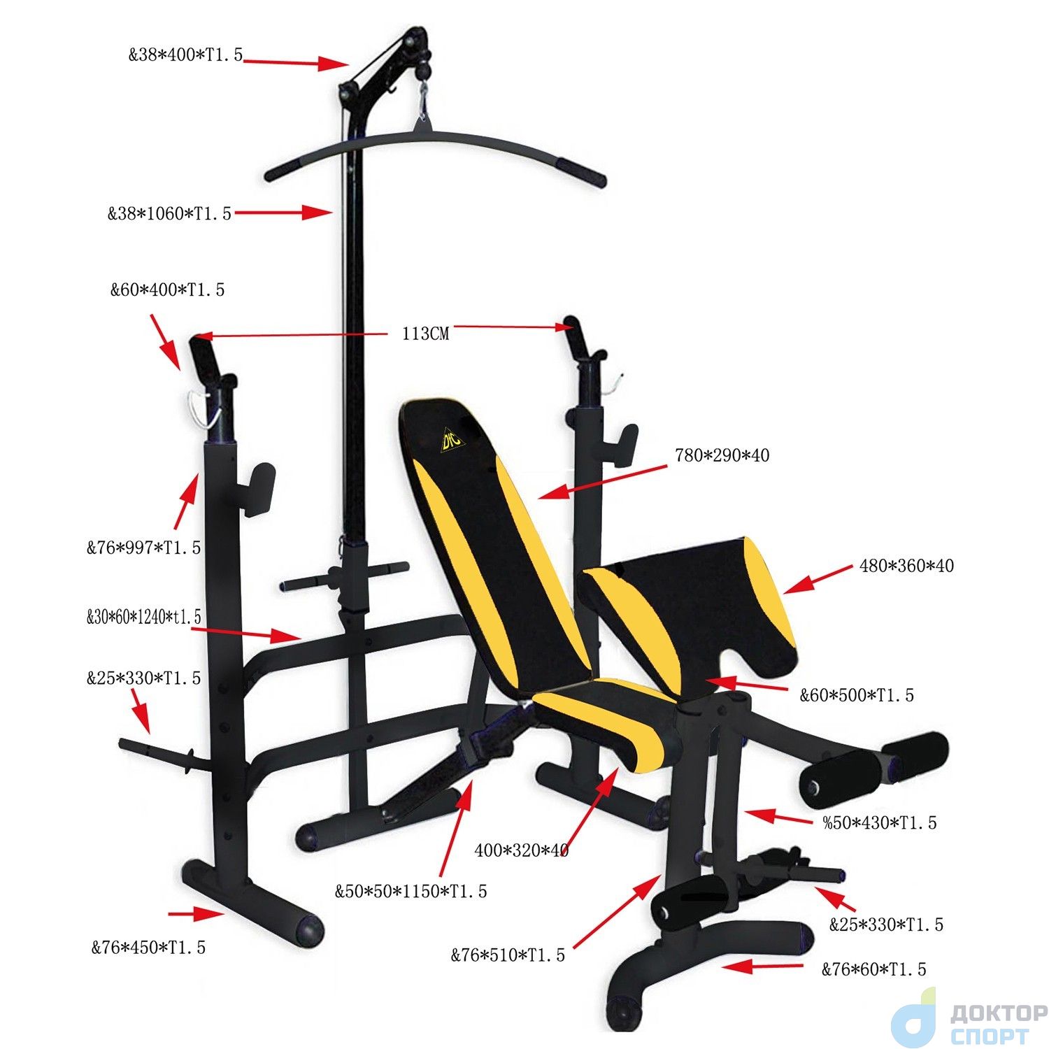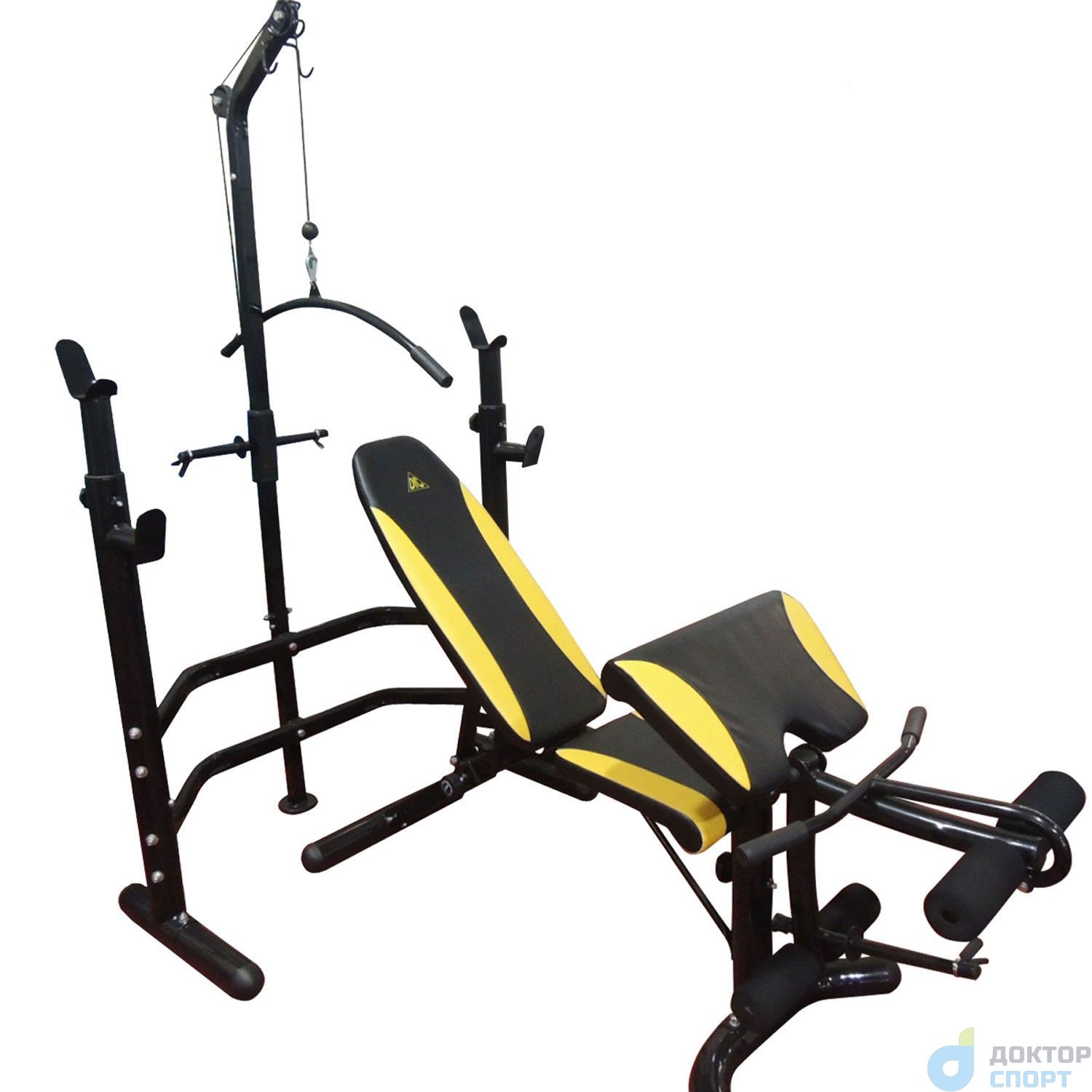 Прочная устойчивая конструкция с ударопрочным эмалевым покрытием. Стойки под штангу с замками безопасности. Рычаги блока для ног снабжены мягкими валиками. На стойках есть держатели для хранения дисков. Позволяет выполнять упражнения: жим лежа, сгибание и разгибание ног в коленном суставе, парта для бицепсов, тяга сверху. Штанга и диски в комплект не входят . В качестве нагрузки используются диски диаметром 26 мм .