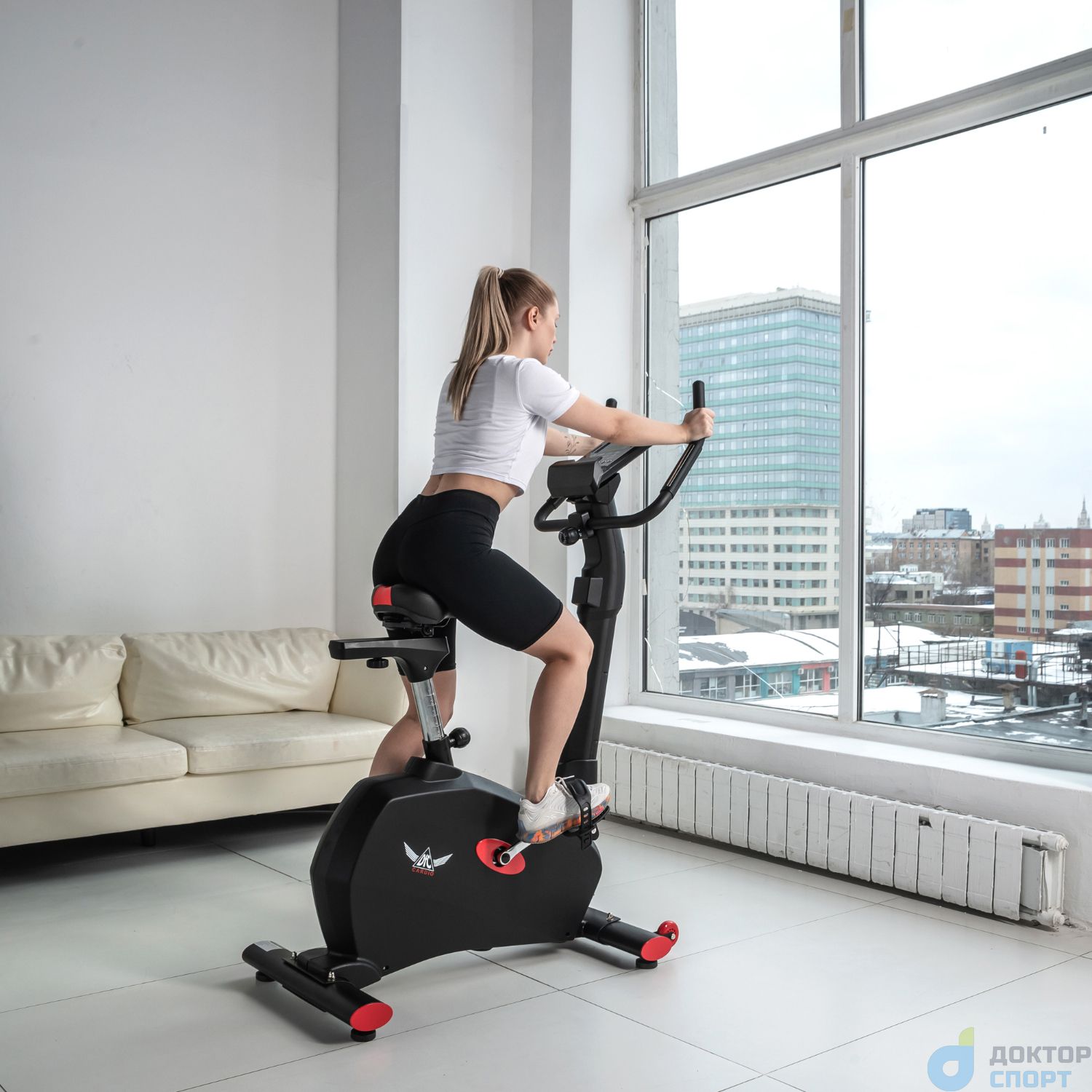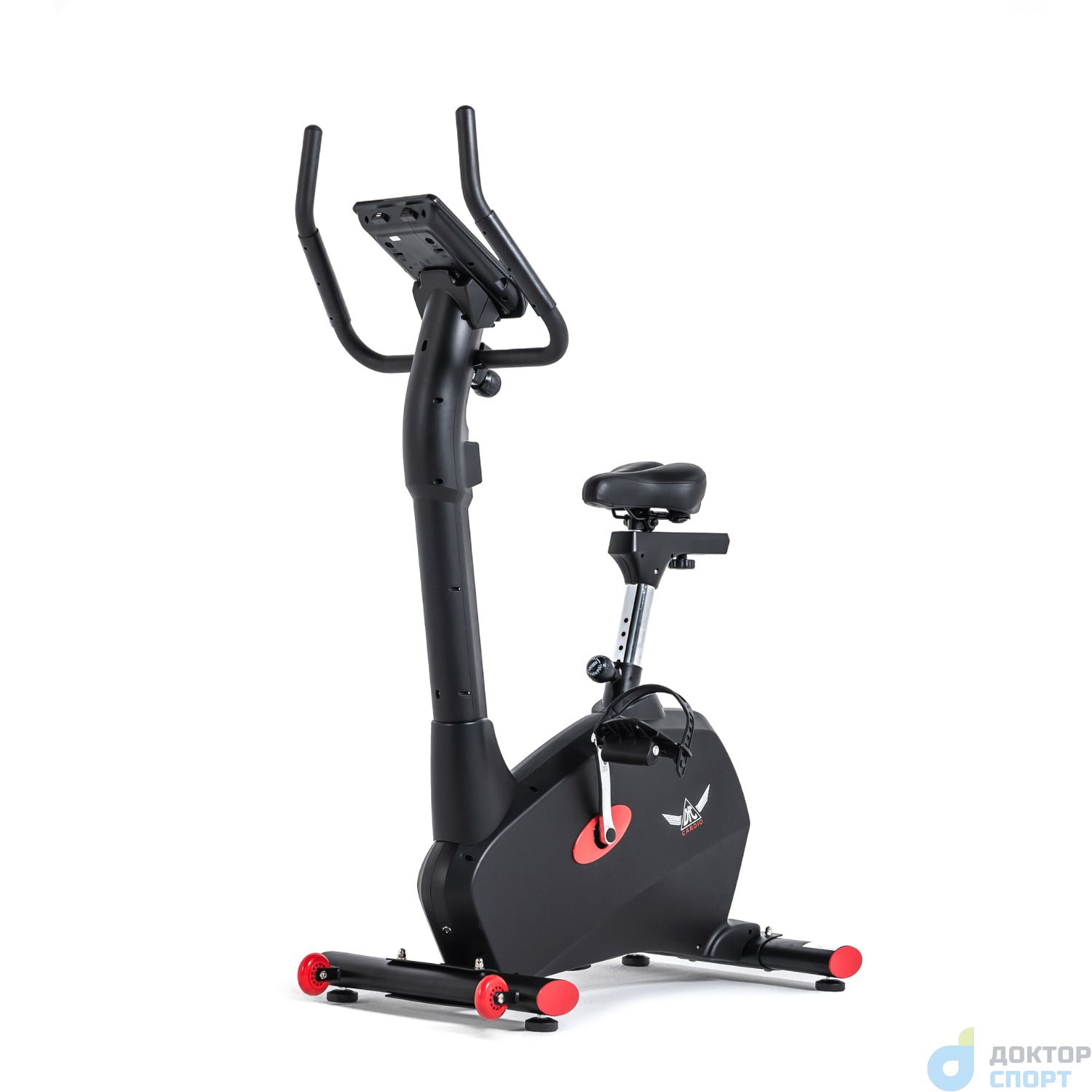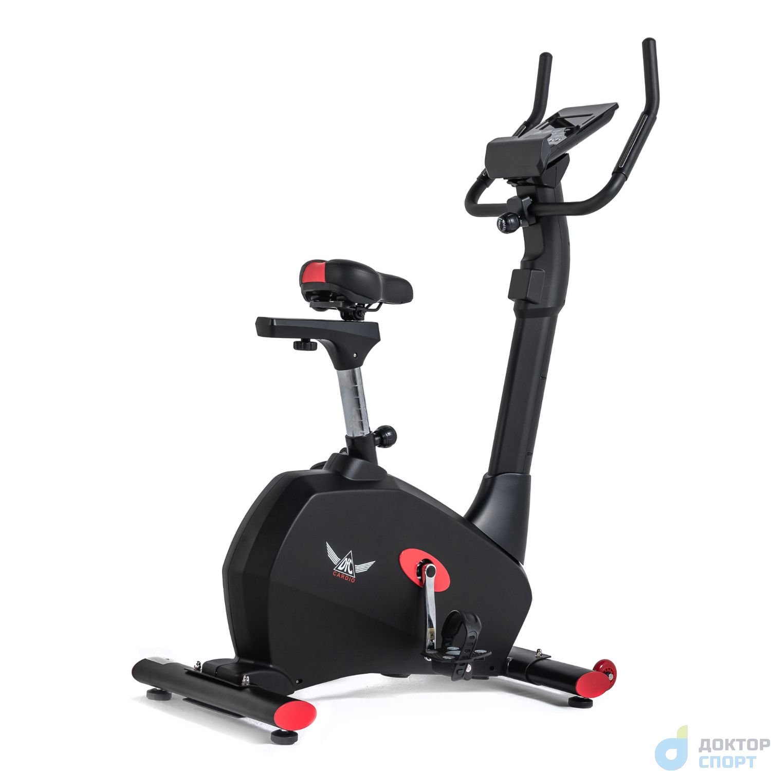 Тренажёр выполнен в стильном дизайне: бархатный чёрный цвет «разбавляют» ярко-красные вставки. Эта модель отмечена и логотипом производителя: крылатым значком DFC Cardio на боковой панели велотренажёра.