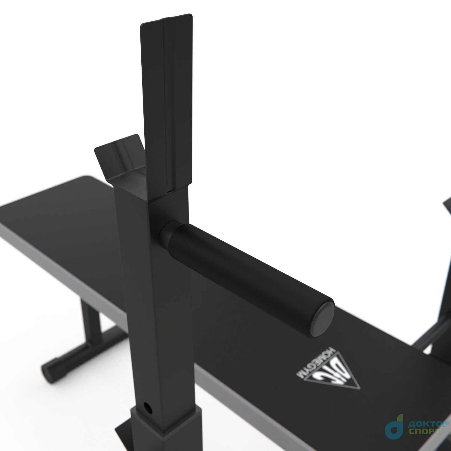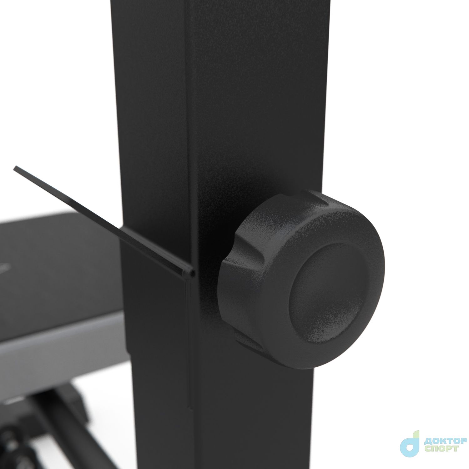 Максимальная нагрузка на верхний держатель — 120 кг, на нижний — 100 кг. На задней части стоек есть ручки для упражнений на руки. На ножках имеются противоскользящие валики и компенсаторы неровности пола.