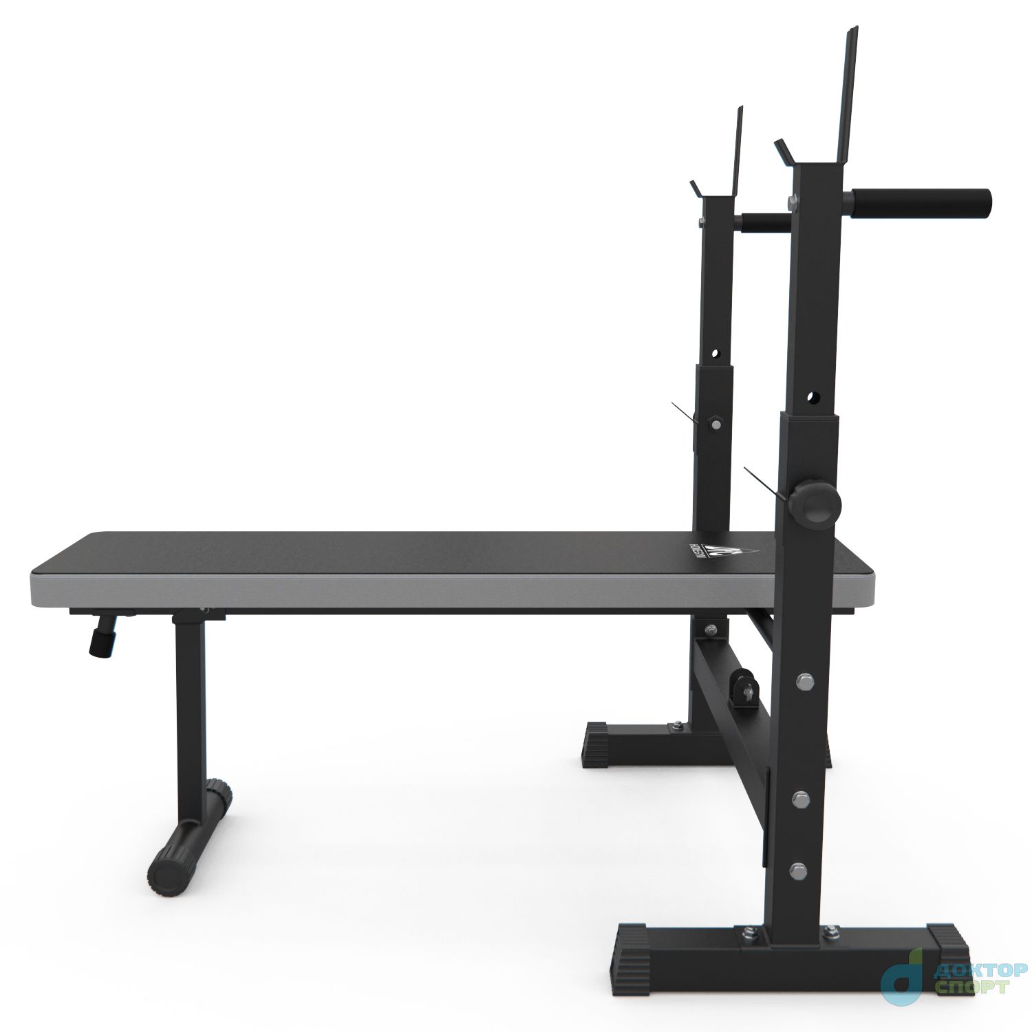 Скамья представляет собой единую складную конструкцию с основанием, обтянутым нескользящей тканью благородного серого цвета. Расстояние от скамьи до пола по нижнему краю (под скамьёй) - 42,5 см. У изголовья расположены две стойки с регулируемой высотой и двумя держателями. Верхний держатель штанги имеет ширину 81,5 см, что является отличительной особенностью скамьи в сравнении с D6453.