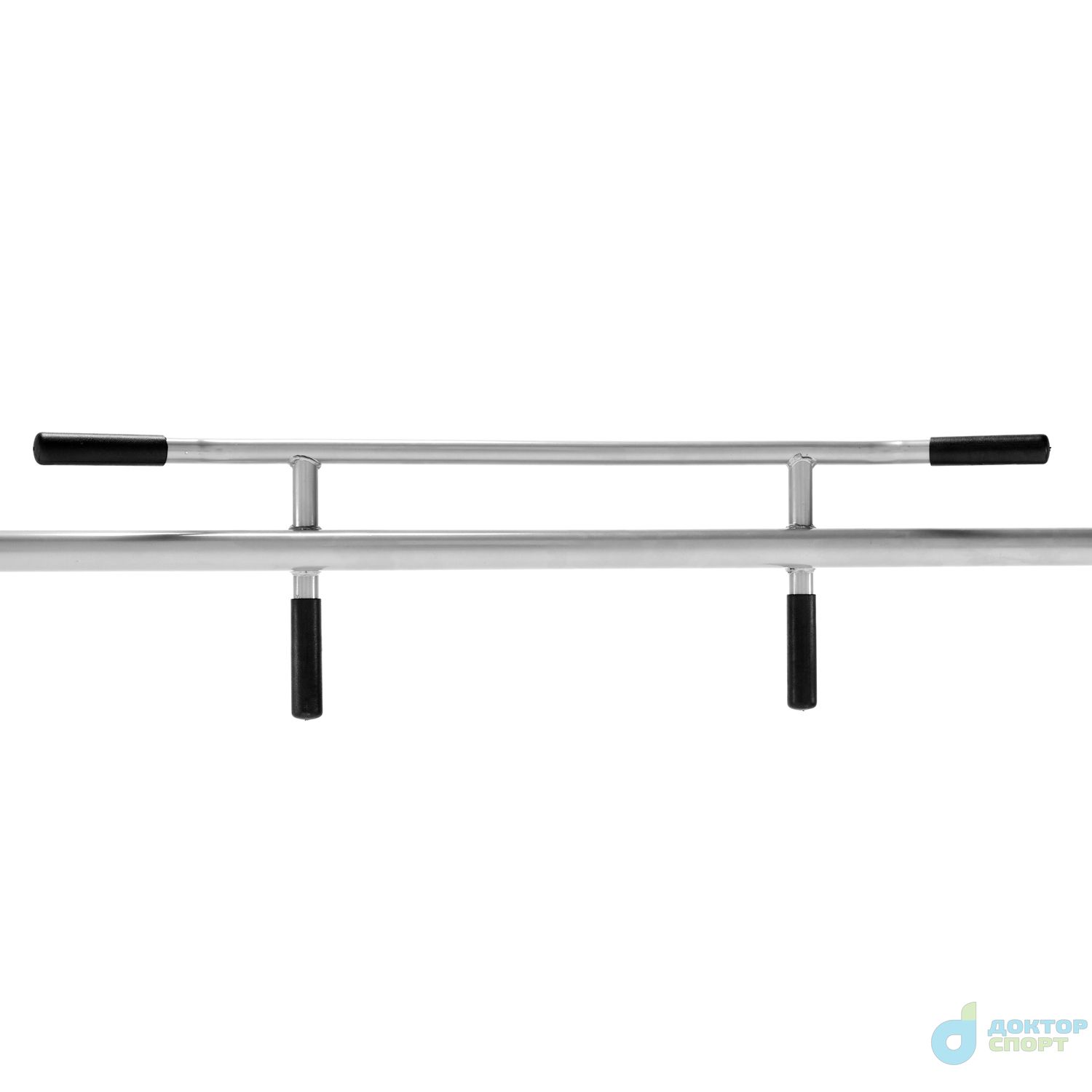 Турник с нескользящими ручками, входящий в комплектацию, выдерживает вес до 100 кг. Положение рук широким хватом хорошо укрепляет спину, руки и плечевой пояс.