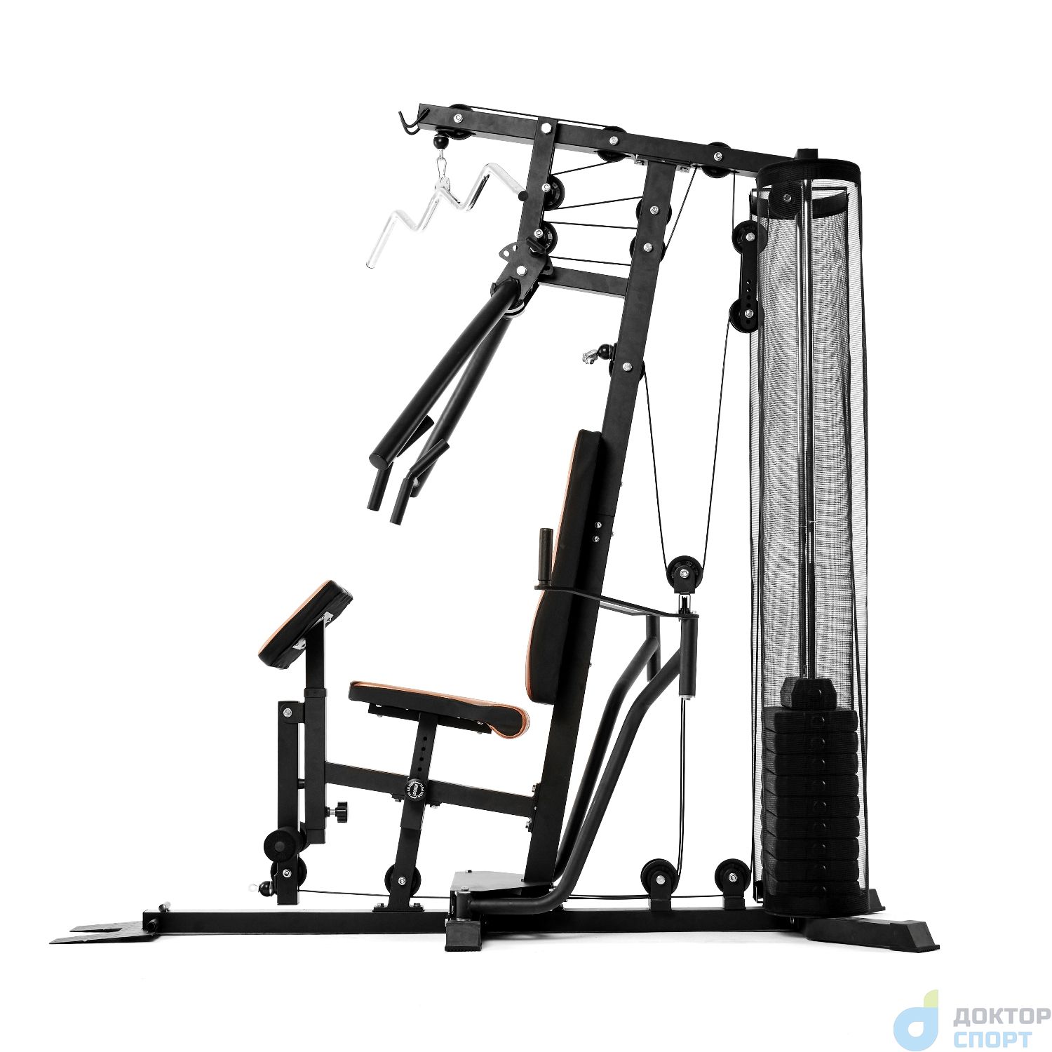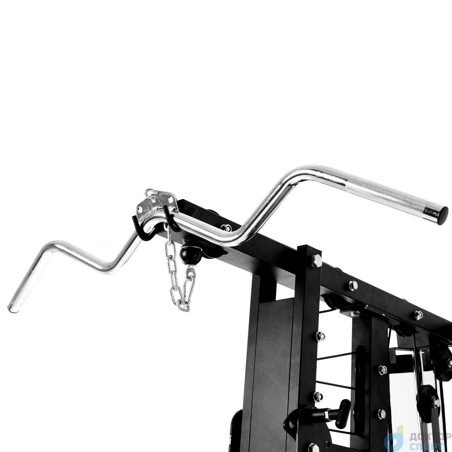 Верхняя тяга (W-образный гриф в комплекте) . Ручки грифа рифлёные, с нескользящей поверхностью. Максимальная нагрузка — 130 кг. Используется для тренировки мышц рук (бицепс, трицепс) и спины.