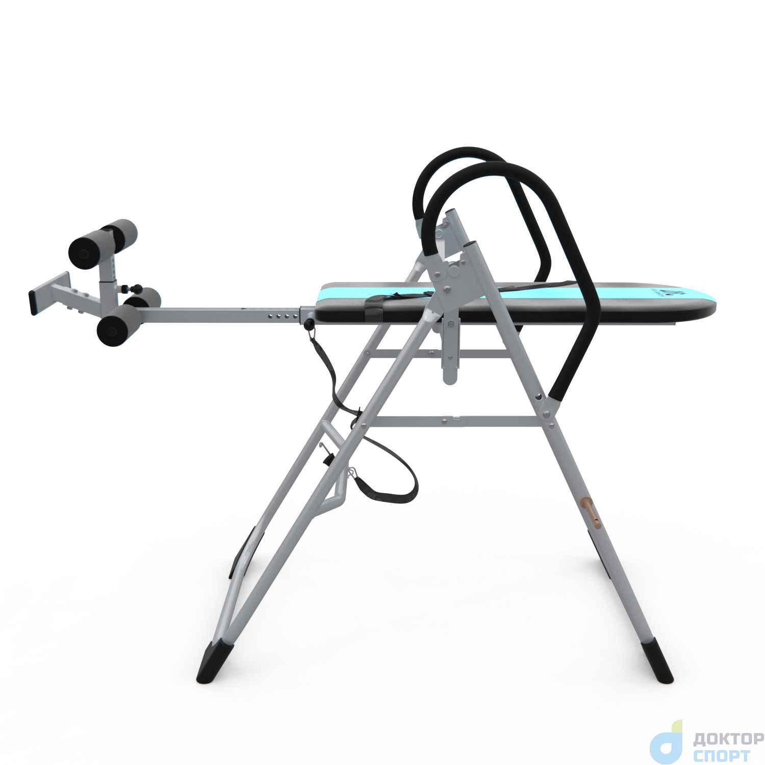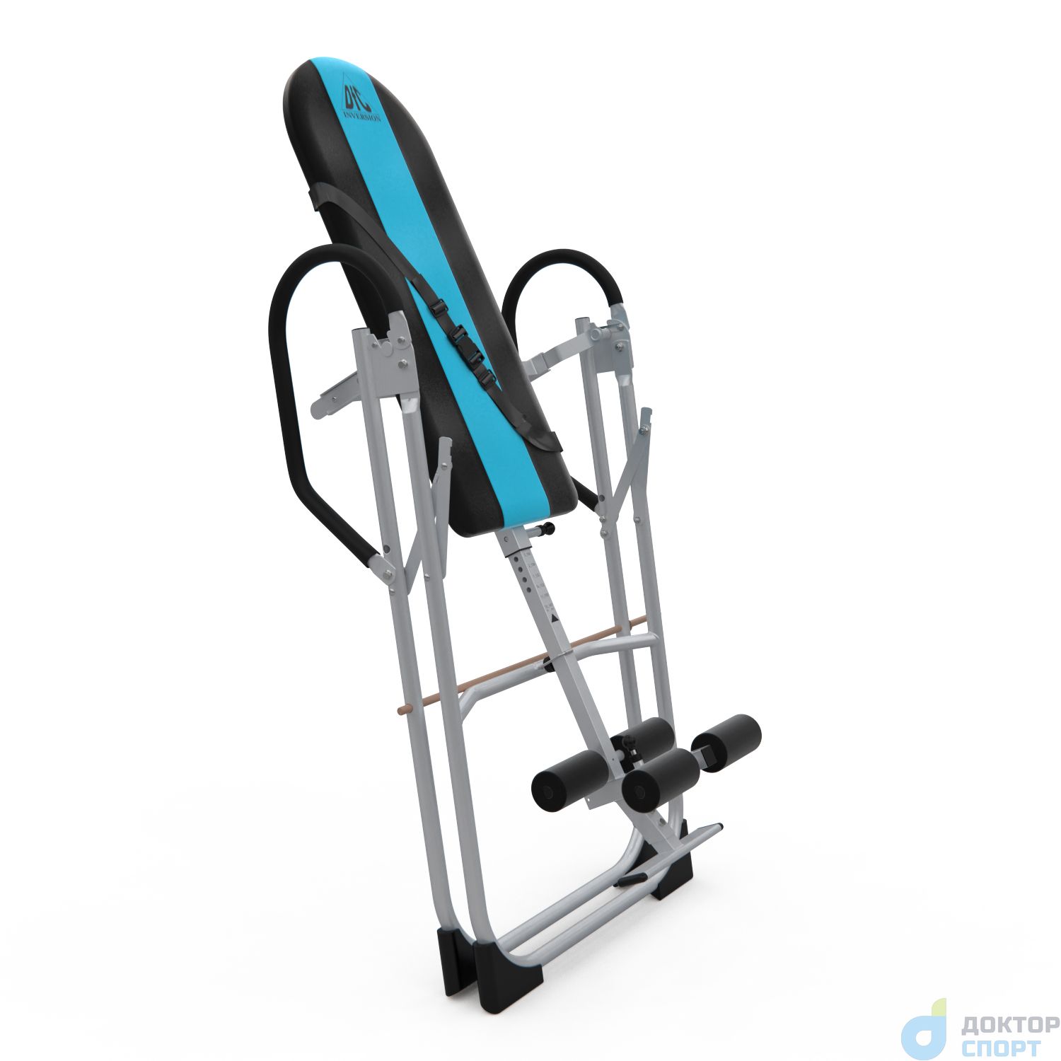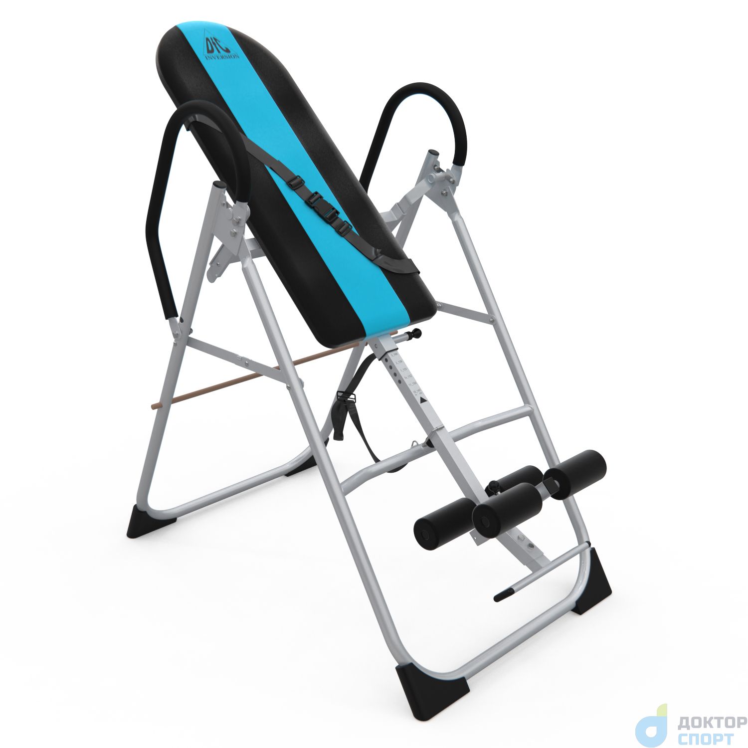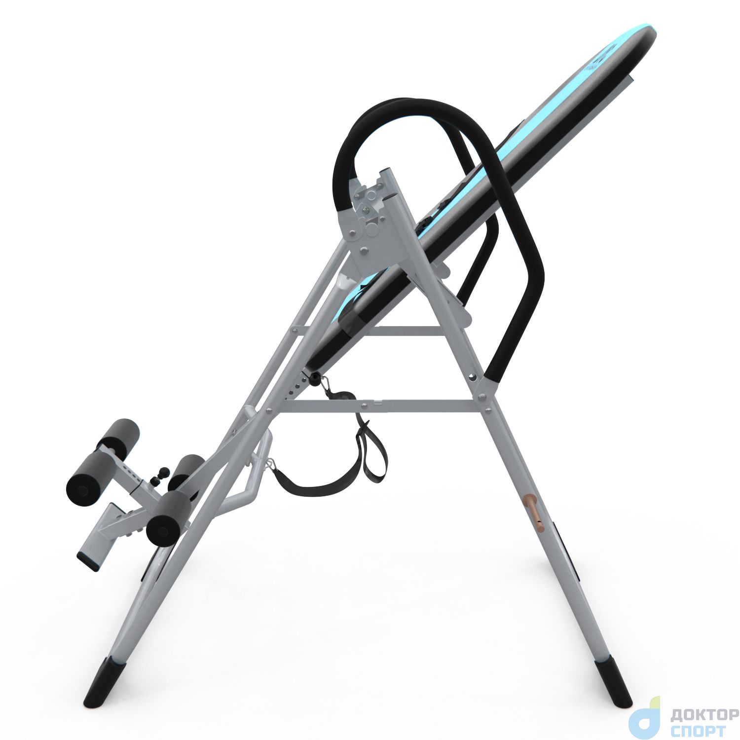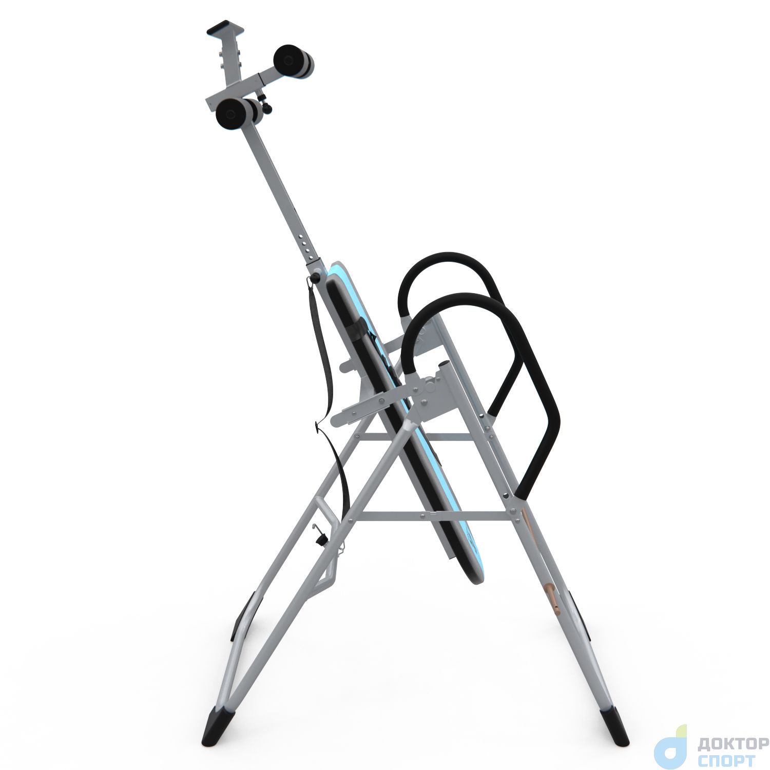 Инверсионный стол складной для домашнего использования с удобной мягкой спинкой. Цвет спинки чёрный с яркой голубой вставкой. Фиксатором для ног являются мягкие валики, регулируемые по длине.
