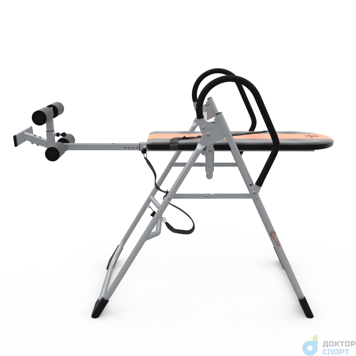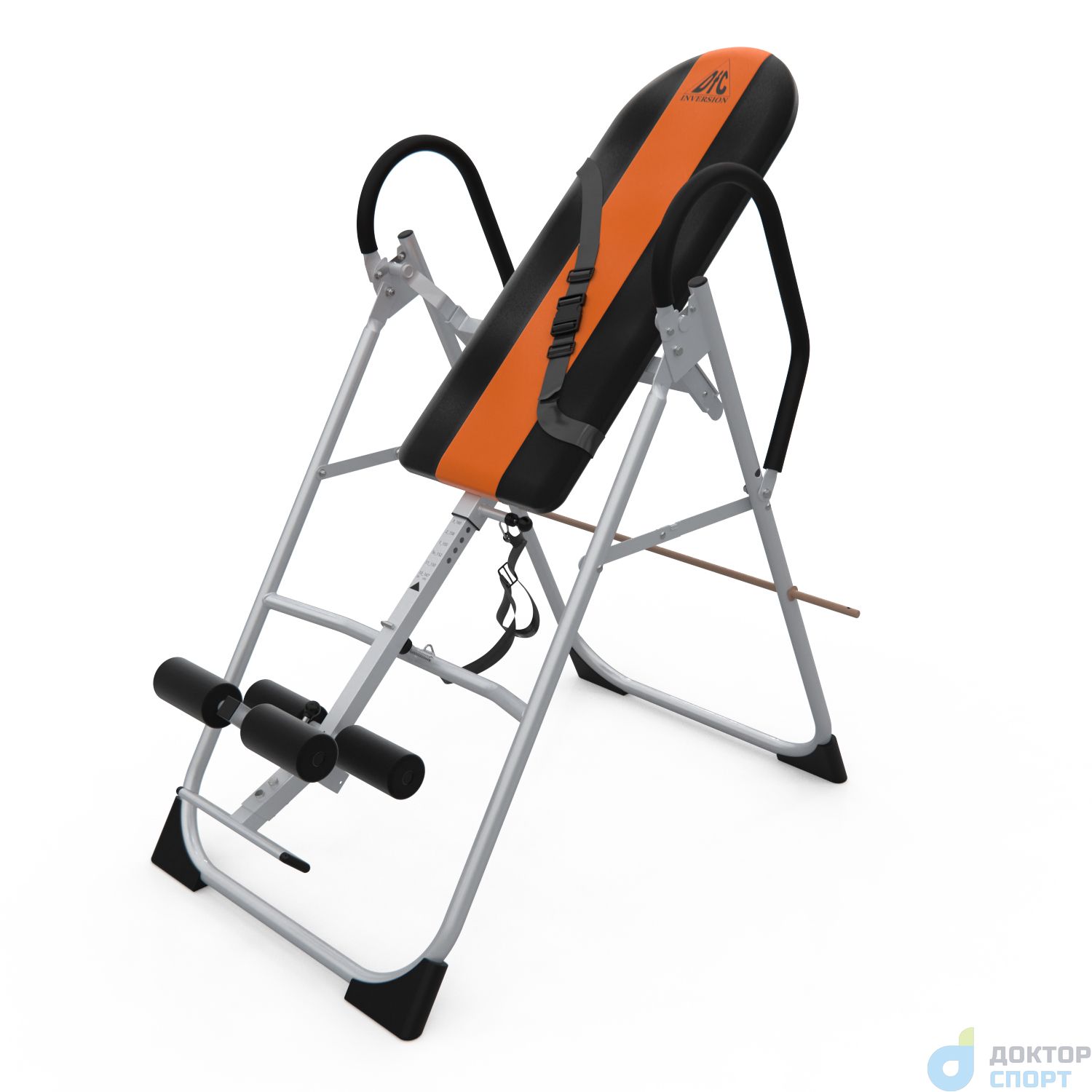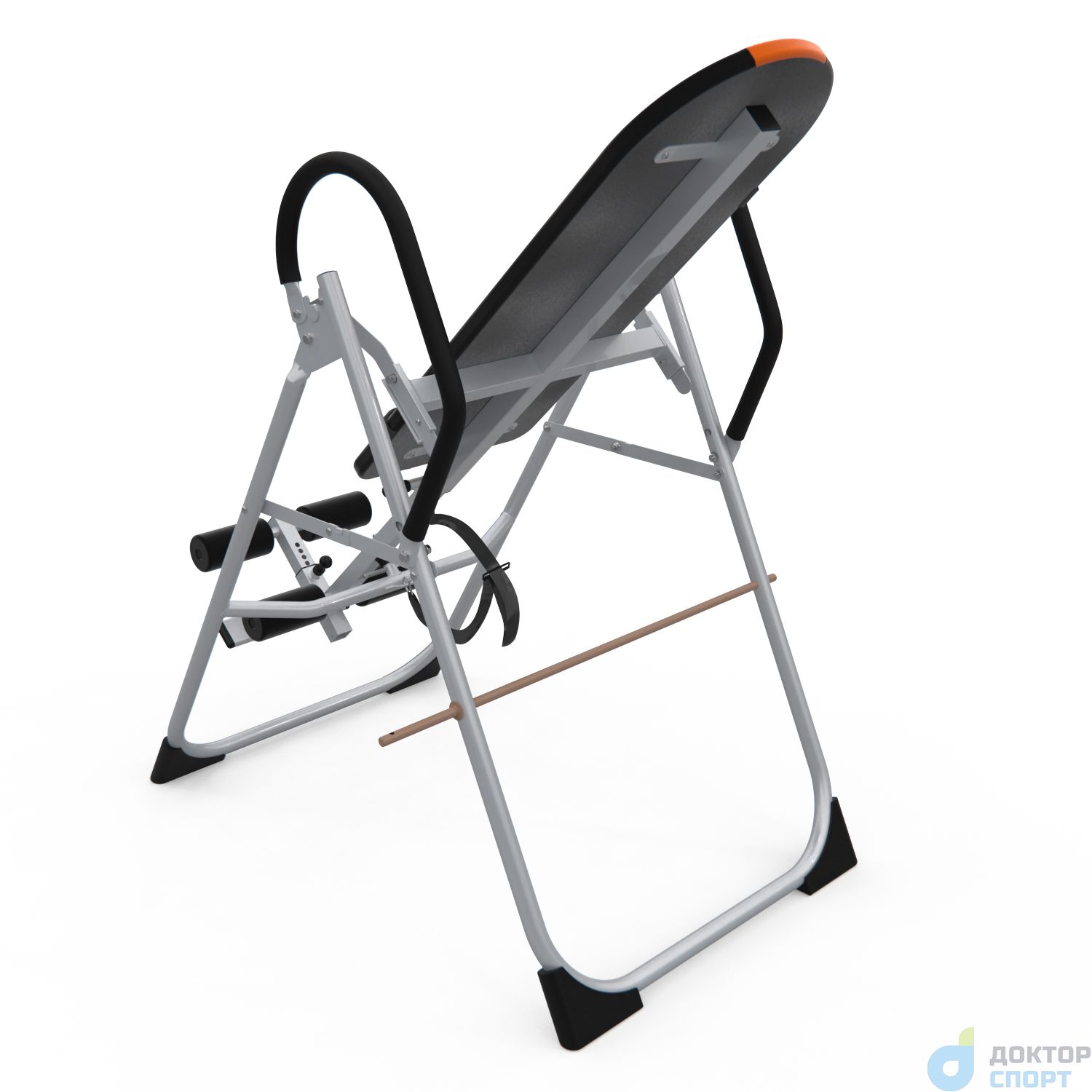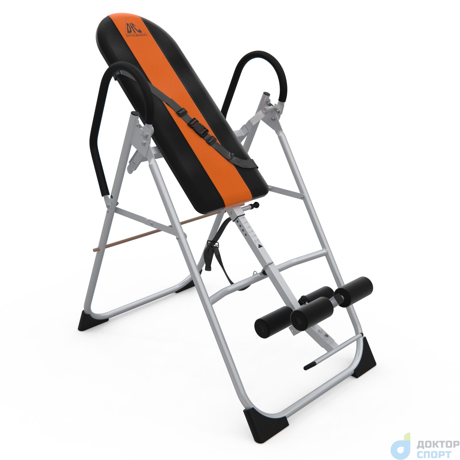 Инверсионный стол складной для домашнего использования с удобной мягкой спинкой. Цвет спинки чёрный с яркой оранжевой вставкой. Фиксатором для ног являются мягкие валики, регулируемые по длине.
