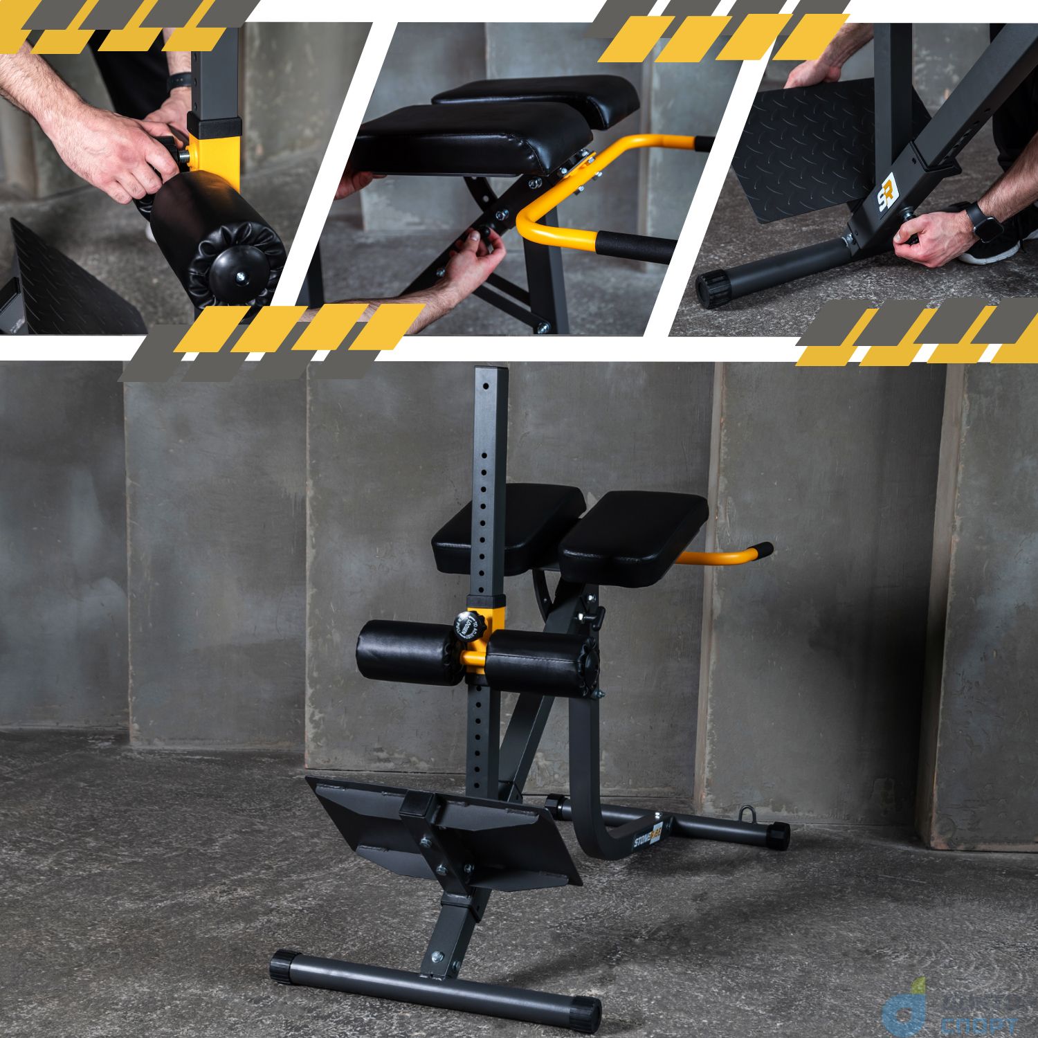 Гиперэкстензия STONERISE HypeRise — это тренажёр, который используют для проработки мышц спины и бёдер. Тренажёр сконструирован таким образом, что позволяет выполнять гиперэкстензию в классической горизонтальной и обратной техниках. Регулировка подушек Угол наклона подушек регулируется в 4-х положениях: 4,5°, 18°, 31,5° и 45°. Данное свойство позволяет выполнять несколько техник гиперэкстензий, в том числе обратную и с наклоном. Подушки для упора, размерами 35 х 19 х 7 см выдерживают динамическую нагрузку до 150 кг. Надёжная фиксация Фиксирующие валики, длиной 17,5 см и диаметром 8 см выдерживают нагрузку до 150 кг. Высота регулируется в 21-м положении: от 40 до 98 см, что даёт простор для выполнения самых разнообразных техник упражнения. Безопасные тренировки Высота опорной платформы регулируется по высоте в 10-ти положениях, благодаря чему HypeRise подойдёт пользователям любого роста. Платформа толщиной 3,5 мм имеет рифлёное покрытие, предотвращающее скольжение во время выполнения упражнений, и выдерживает вес пользователя до 150 кг. Поручни поддержки Поручни, длиной 25 см, выдерживают нагрузку до 100 кг. Их диаметр составляет 25 мм, а толщина - 1,5 мм. Прочная основа Профиль тренажёра изготовлен из квадратной трубы 50 х 50 х 1,5 мм и круглых труб 50 х 1,5 мм. На передних ножках расположены резиновые накладки для защиты поверхности пола при тренировке. На задних ножках - компенсаторы неровности пола, покрутив которые вы сможете ровно поставить тренажёр. Также под ручками предусмотрены крепления для эспандеров (в комплект не входят). -