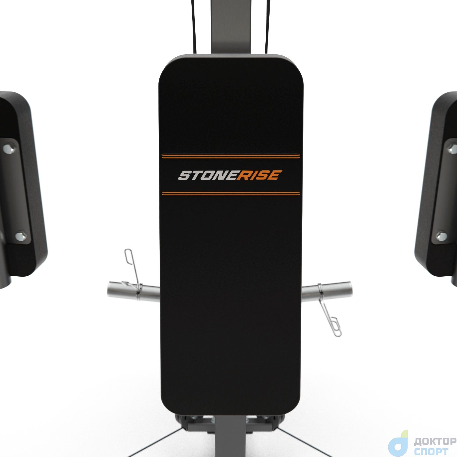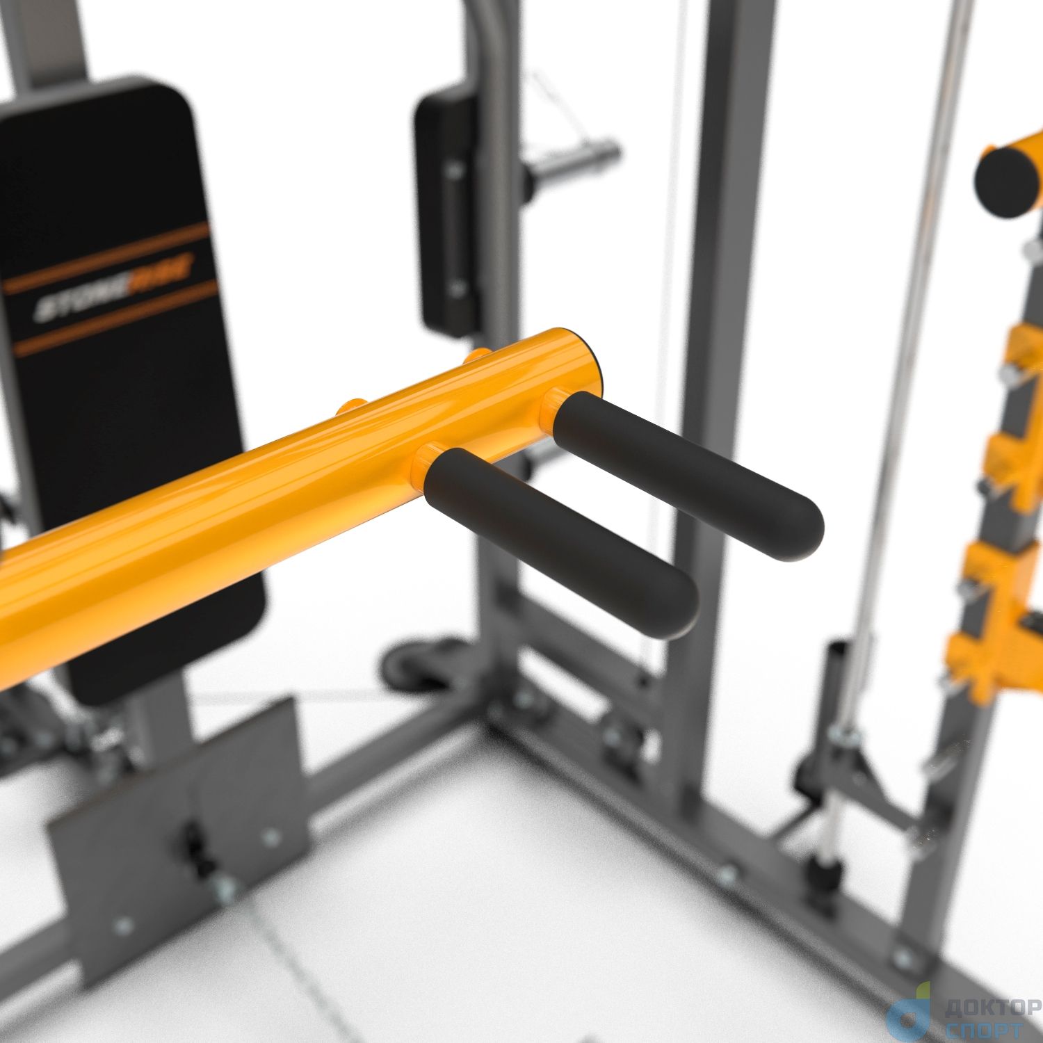 Мультистанция, Машина Смита STONERISE D873. Многочисленные функции тренажёра поспособствуют совокупному развитию мышц всего организма. Максимальная нагрузка на конструкцию и гриф допустима до 300 кг. Турник, ширина которого 200,5 см выдерживает до 200 кг, а тяга снизу и поручни для отжиманий - 180 кг. Нагрузка на спинку скамьи допустима до 250 кг. Баттерфляй и держатель грифа для жима лэндмайн выдерживают до 100 кг - держатель подходит для грифа диаметром 51 мм. В зависимости от потребностей, пользователь может регулировать высоту снарядов в 11-ти положениях от 43,5 см с шагом 13 см. Для удобства гриф оснащён замком Jaw-Lock, который не нужно раскручивать - достаточно одного щелчка, чтобы зафиксировать диски на грифе. Спинка скамьи размерами 74,5 х 29,5 см и толщиной 5 см, а также подлокотники баттерфляя длиной 82 см из прочной водоотталкивающей ткани. Для утяжеления используются диски диаметром 51 мм с центральным отверстием ( в комплект поставки не входят! ). Хранить диски возможно прямо на мультистанции: каждый из шести держателей выдерживает до 100 кг. Конструкция D873 устойчивая и долговечная: тросы толщиной 5 мм легко выдерживают постоянное использование, а корпус из профиля 50 х 70 х 2 мм сохранит устойчивость во время самых активных тренировок. В комплект D873 входят: 2 ручки для подтягивания на брусьях держатель для выполнения жима лэндмайн баттерфляй J-образные держатели для штанги 2 ручки на цепях для тяги сверху и снизу пружинный зажим для регулировки амплитуды движения ограничители амплитуды движения -